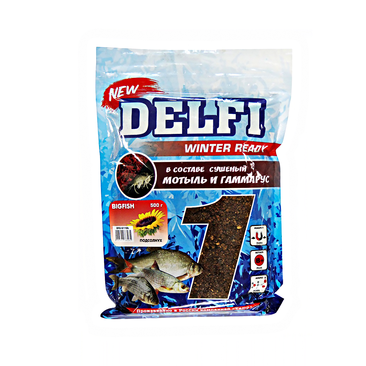 Прикормка зимняя Delfi Ice Ready увлажненная 500гр Большая рыба, Подсолнух, коричневая