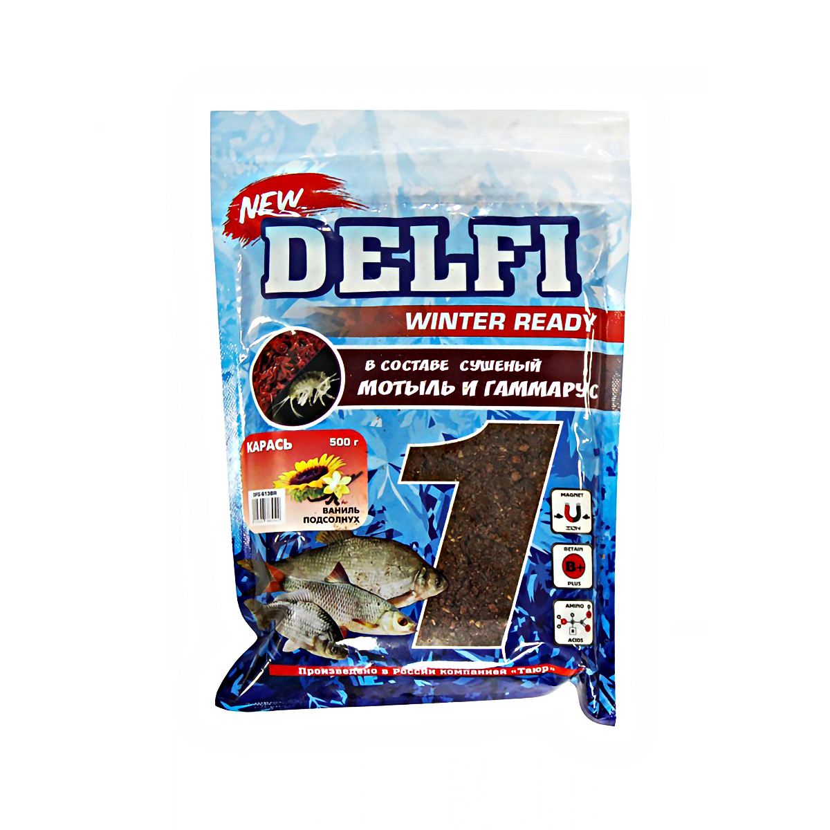 Прикормка зимняя Delfi Ice Ready увлажненная 500гр Карась, Ваниль-Подсолнух, коричневая