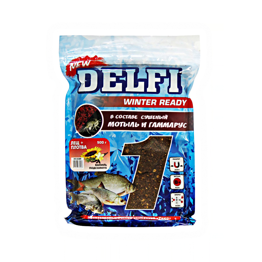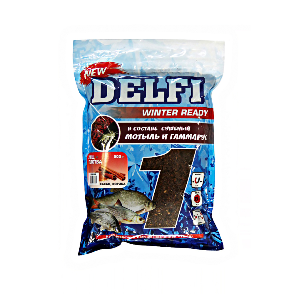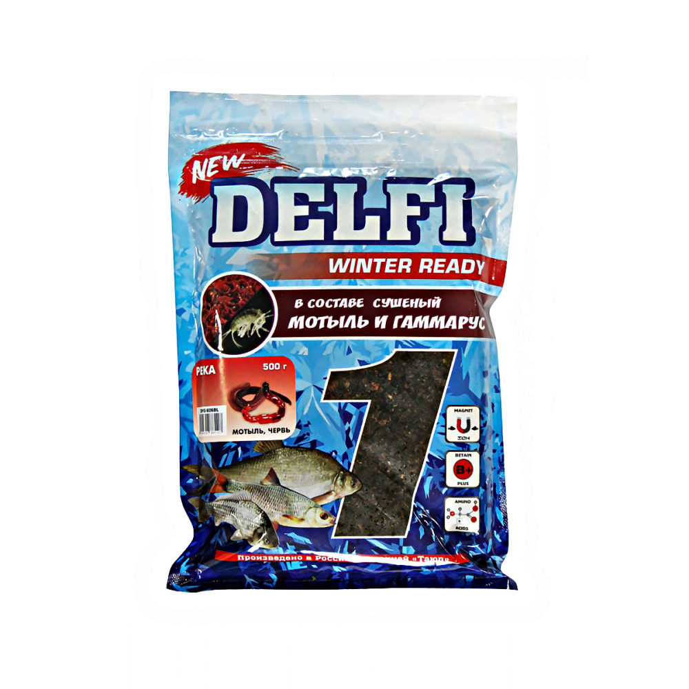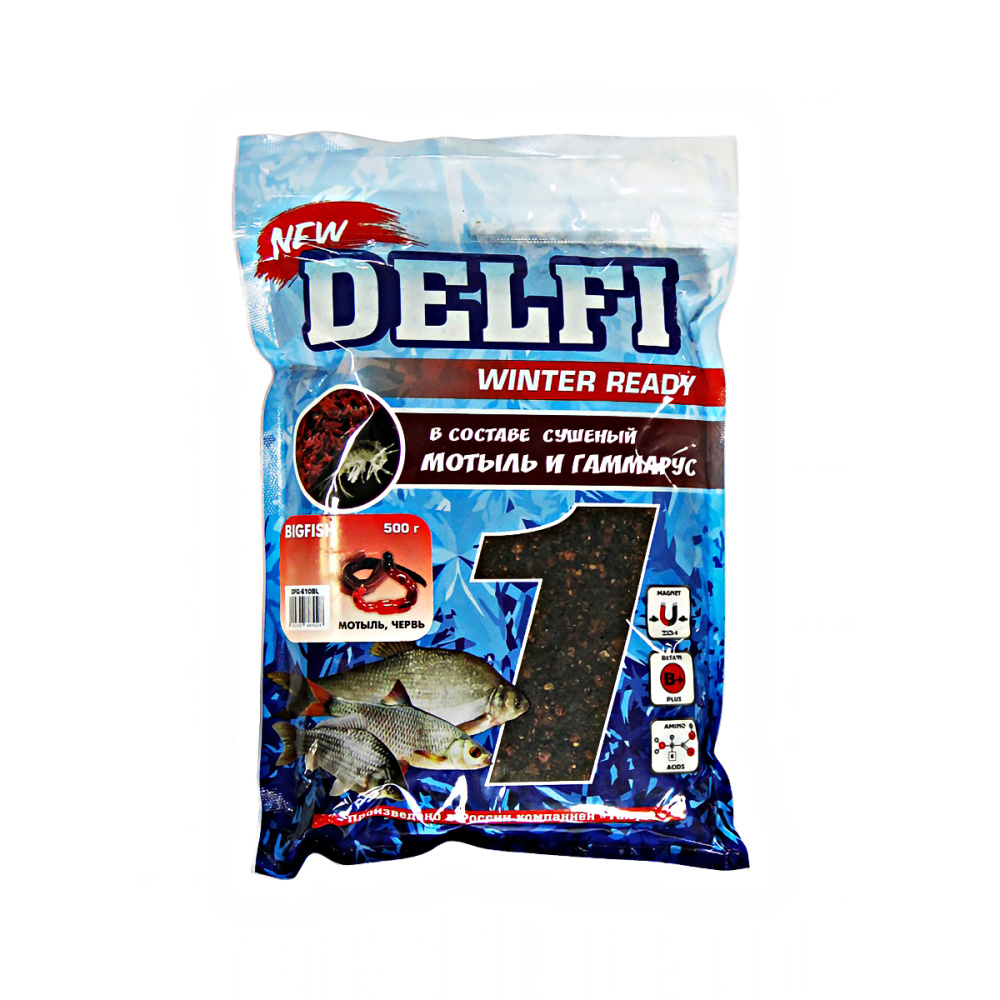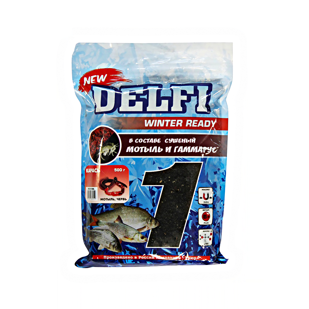 Прикормка зимняя Delfi Ice Ready увлажненная 500гр Карась, Мотыль-Червь, черная