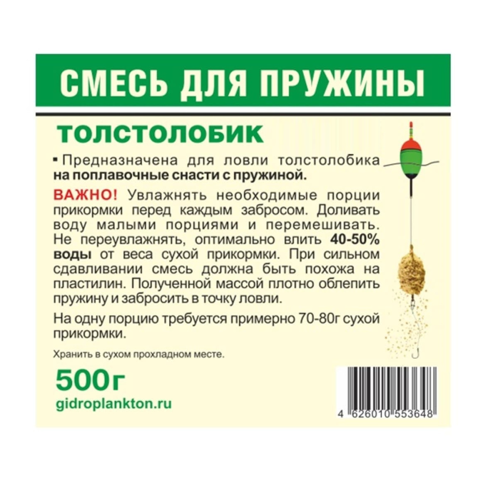 Прикормку смешать с водой до состояния крутого теста или пластилина. Доливать воду малыми порциями, оптимально влить 70% воды от веса сухой прикормки. Полученную массу промять и максимально платно забить в пружину. Увлажнять не всю проикормку сразу, а только необходимые порции для каждого заброса.