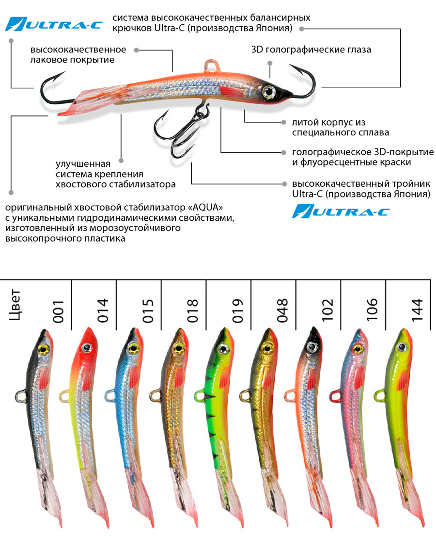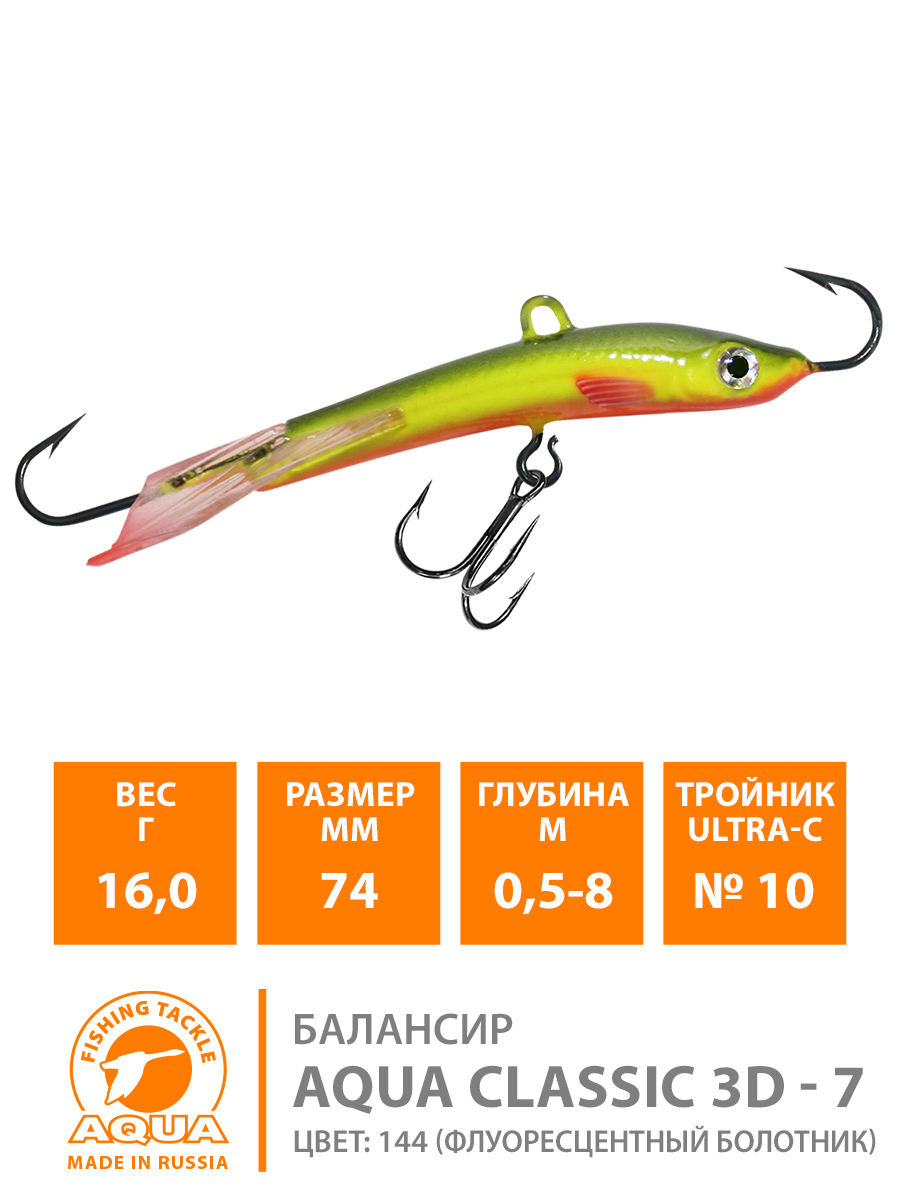 Балансиры Aqua Classic 3D имеют специальное голографическое покрытие, с максимальным эффектом отражающее скудный свет, который поступает под лед вглубь водоема. Кроме того, все рыболовные балансиры данной модели оснащены очень острым тройником со светящейся трехцветной капелькой, которая имитирует глаз окуня, по традиции именуемый финским.