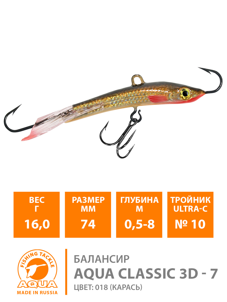 Балансиры Aqua Classic 3D имеют специальное голографическое покрытие, с максимальным эффектом отражающее скудный свет, который поступает под лед вглубь водоема. Кроме того, все рыболовные балансиры данной модели оснащены очень острым тройником со светящейся трехцветной капелькой, которая имитирует глаз окуня, по традиции именуемый финским.