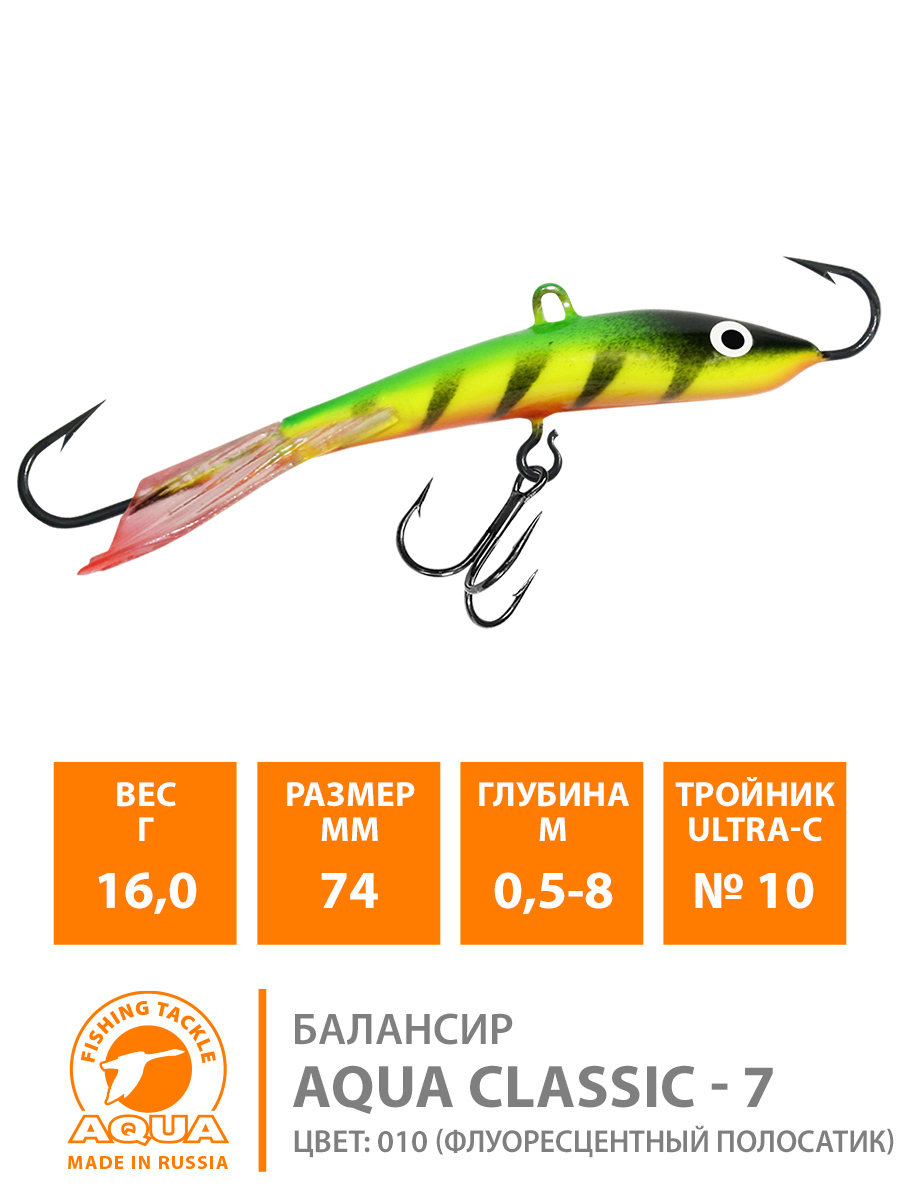 Балансир Aqua Classic-7 74мм 16гр цвет 010 (флуоресцентный полосатик)