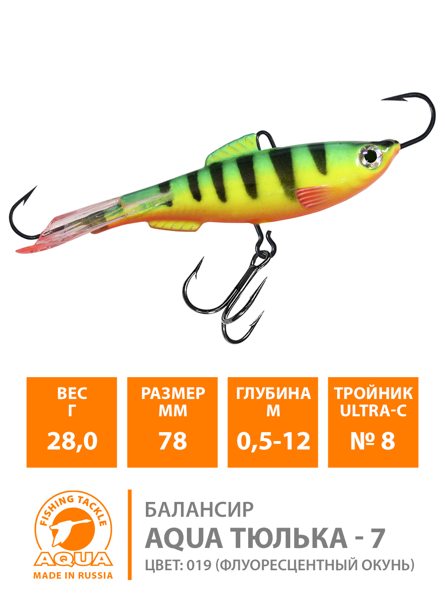 Балансир Aqua Тюлька-7 78мм 28гр цвет 019 (флуоресцентный окунь)