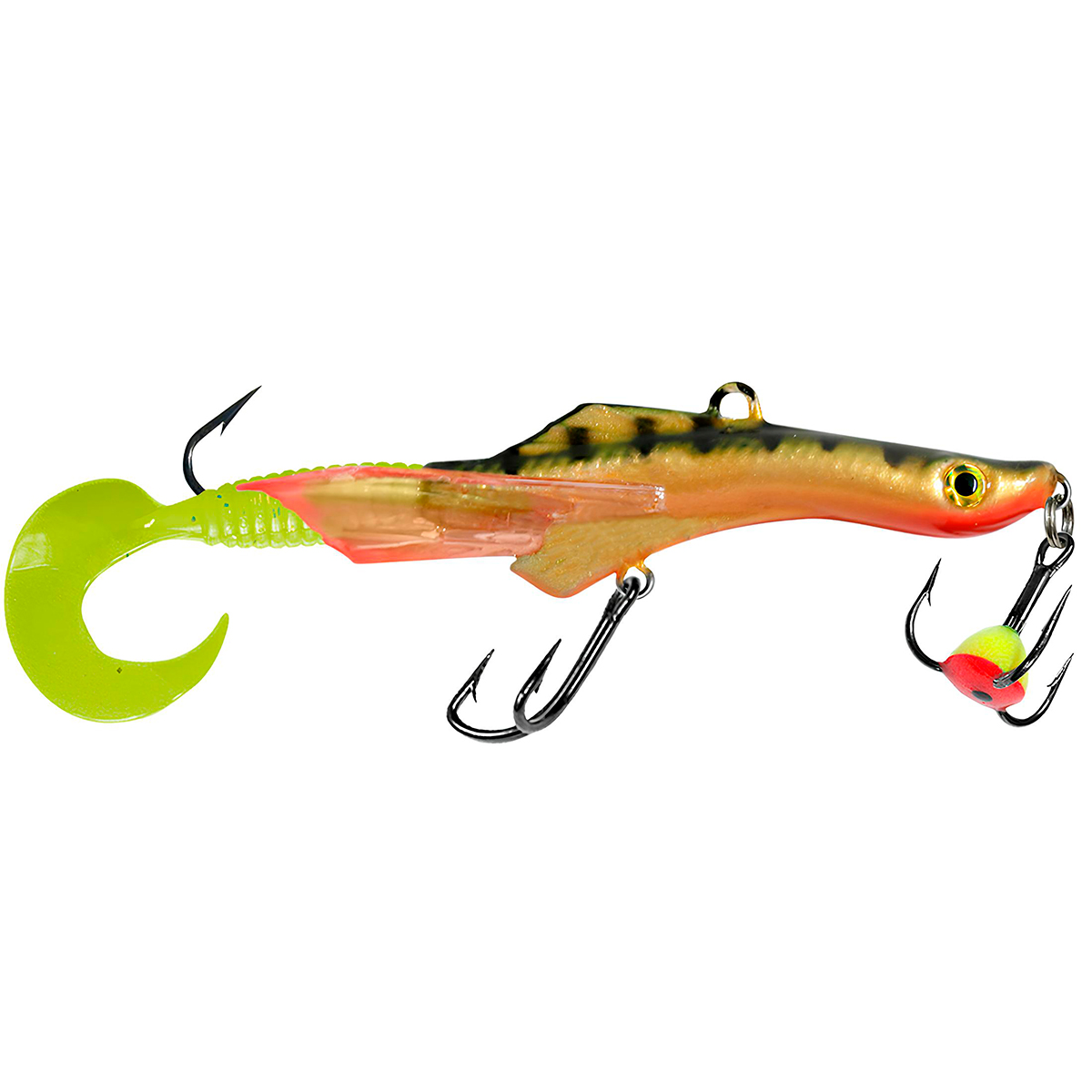 - В первом варианте балансир используется как отвесная блесна. При взмахе удильником вверх приманка отклоняется от вертикальной линии и начинает долгое движение до момента остановки, как говорят рыбаки «уходит от лунки». После полной остановки «Тритона», необходимо несколько раз «потрясти удильником», что создает у хищника иллюзию кормящегося малька. Тройник с фосфорной каплей повешенный за носовую петлю имитирует икринку, личинку или рачка, которого малек раскопал в отложении донного грунта.