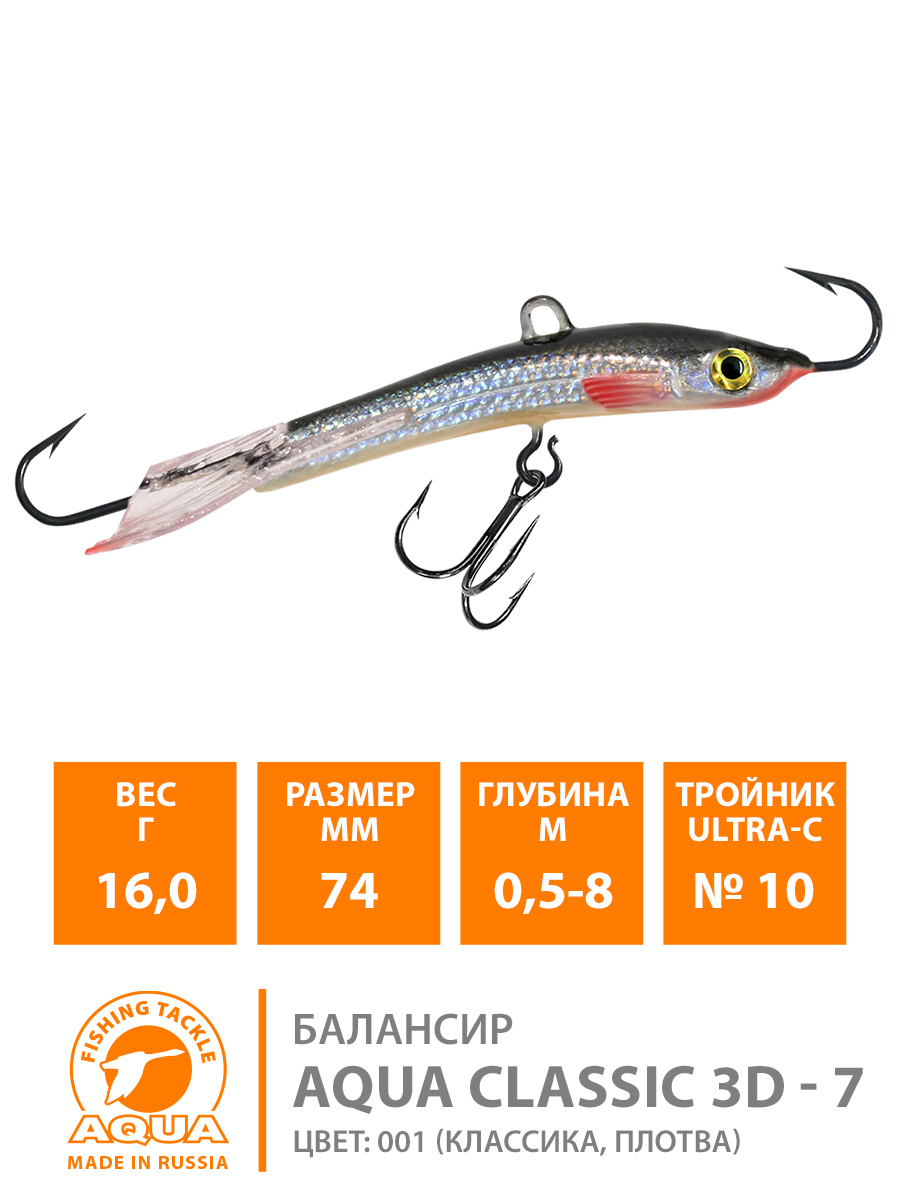 Балансиры Aqua Classic 3D имеют специальное голографическое покрытие, с максимальным эффектом отражающее скудный свет, который поступает под лед вглубь водоема. Кроме того, все рыболовные балансиры данной модели оснащены очень острым тройником со светящейся трехцветной капелькой, которая имитирует глаз окуня, по традиции именуемый финским.