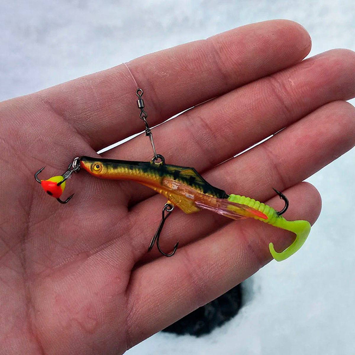 - В первом варианте балансир используется как отвесная блесна. При взмахе удильником вверх приманка отклоняется от вертикальной линии и начинает долгое движение до момента остановки, как говорят рыбаки уходит от лунки. После полной остановки Тритона, необходимо несколько раз потрясти удильником, что создает у хищника иллюзию кормящегося малька. Тройник с фосфорной каплей повешенный за носовую петлю имитирует икринку, личинку или рачка, которого малек раскопал в отложении донного грунта.