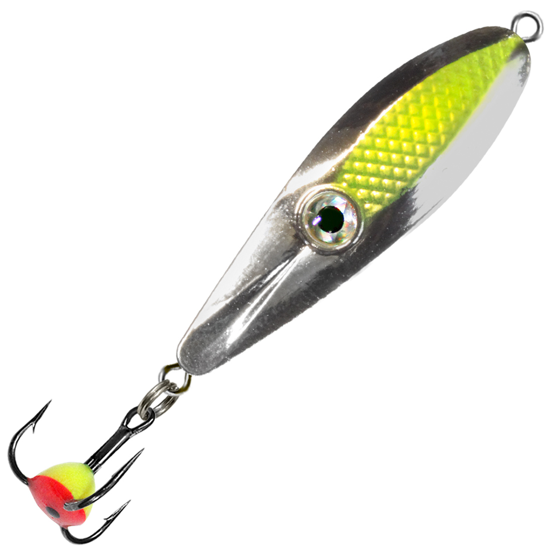 Компактное тело с выраженной 3D глаз-линзой создаёт яркий световой сигнал и дополнительную точку атаки, провоцируя хищника даже в пассивные периоды подо льдом. Такой визуальный эффект заметен в мутной воде и в сумерках, что повышает реализацию поклёвок при отвесном блеснении.