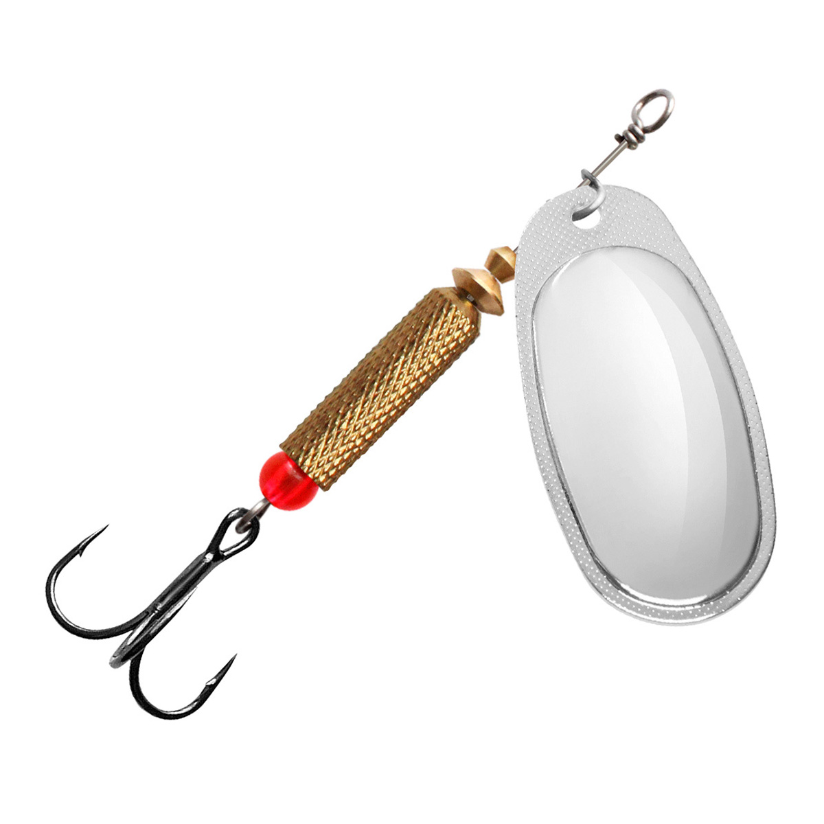 - полированного лепестка из цветного металла классической формы с боковой чеканкой, который делает игру приманки максимально стабильной – без «залипаний» в момент проводки. Выпуклая форма лепестка работает как сферическое зеркало, позволяя отражать любой лучик света, с какой бы стороны он не упал на блесну, что особенно полезно при ловле на глубине или в мутной, плохо освещенной воде.