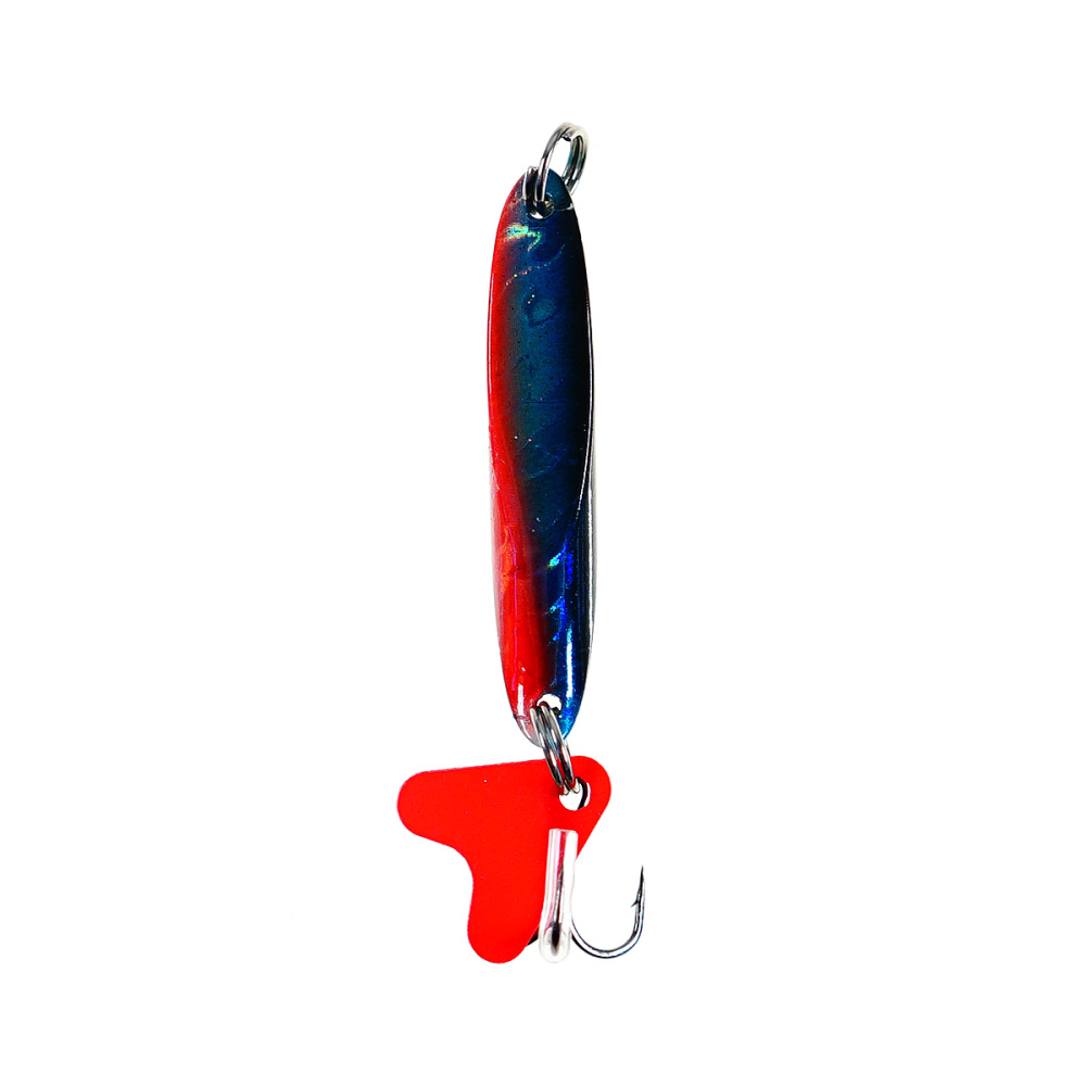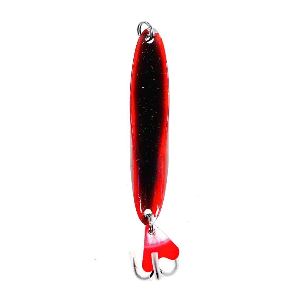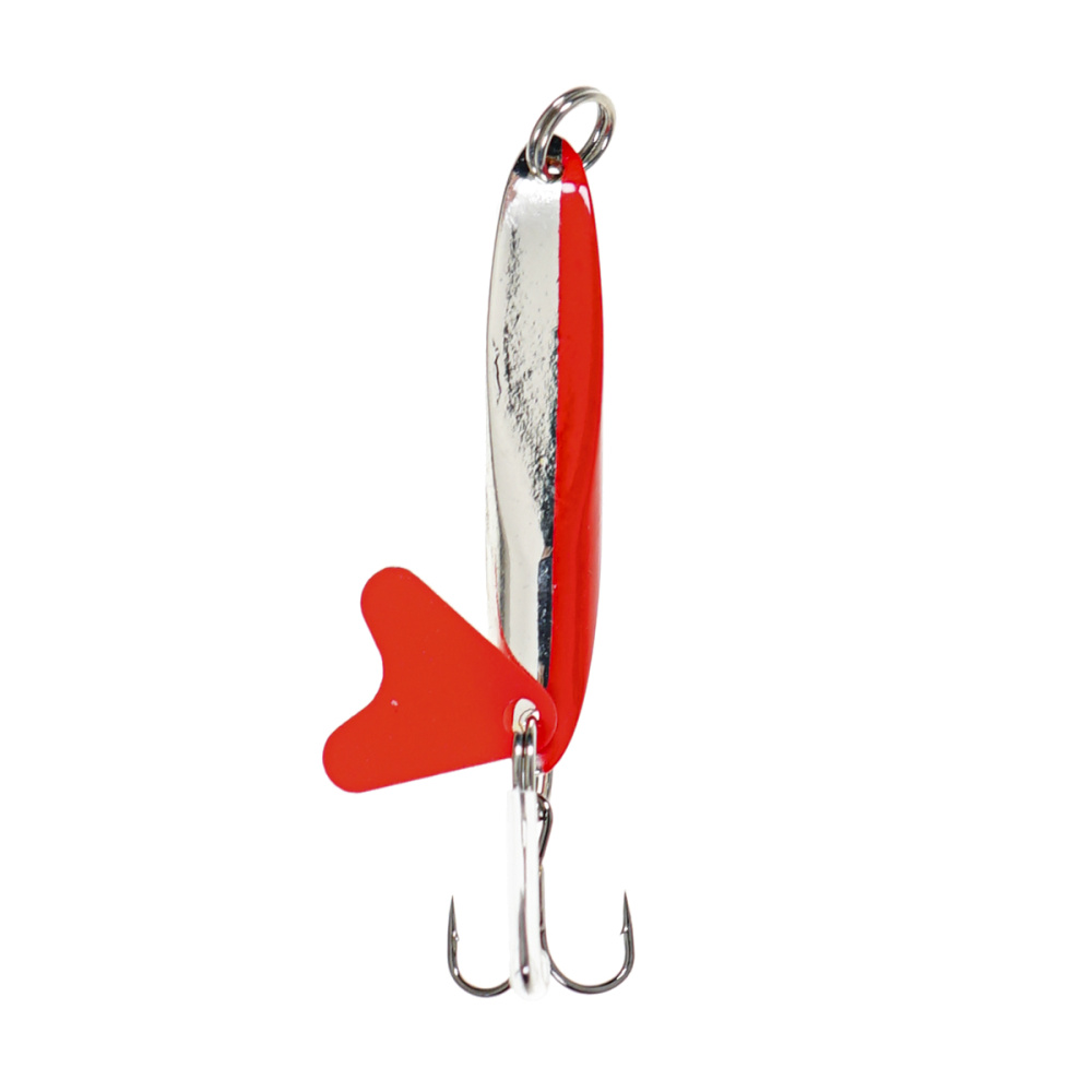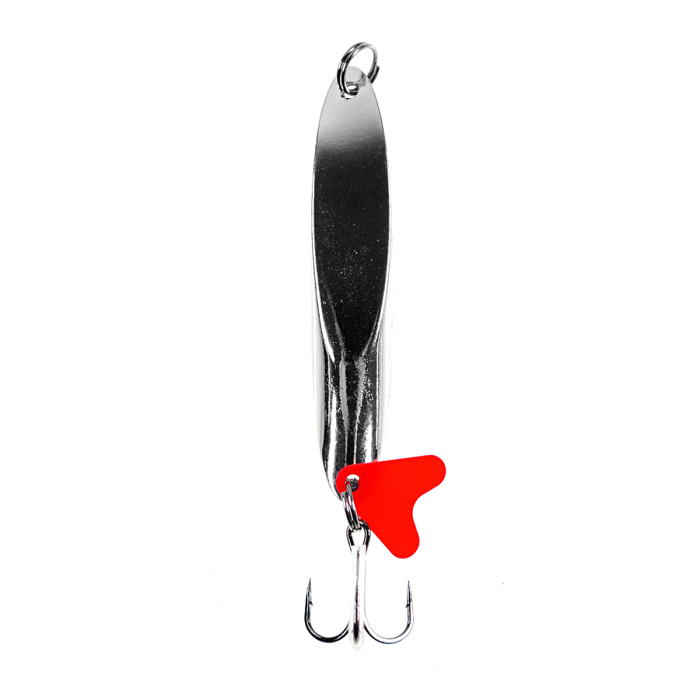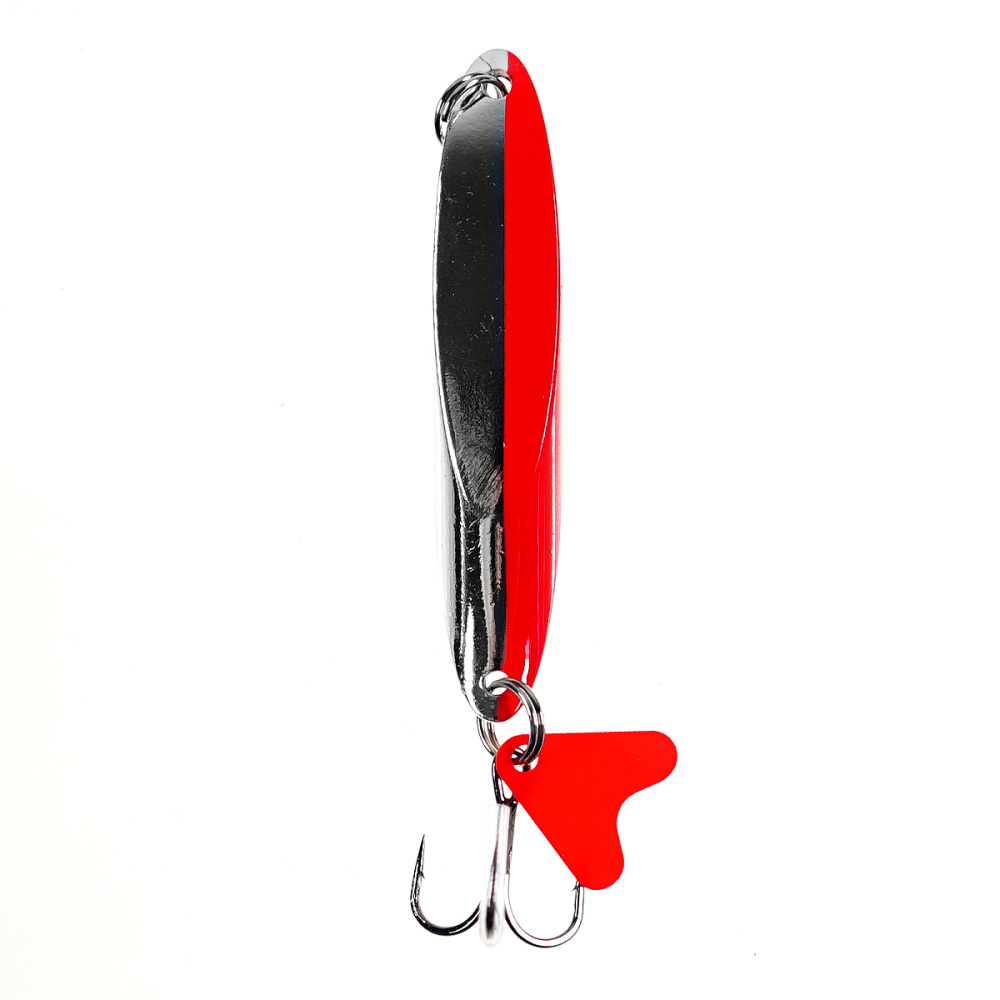 В сравнении с классическими «кастмастер»-формами, радиусные кромки создают более выраженную работу на сносе и в свободном падении — приманка дольше «живёт» в зоне атаки и провоцирует поклёвки пассивного хищника. Тройник оснащён красным пластиковым плавничком, формирующим точку прицеливания и повышающим реализацию поклёвок.