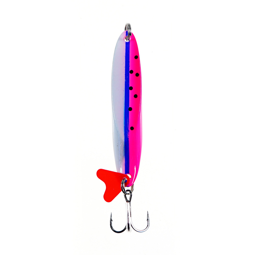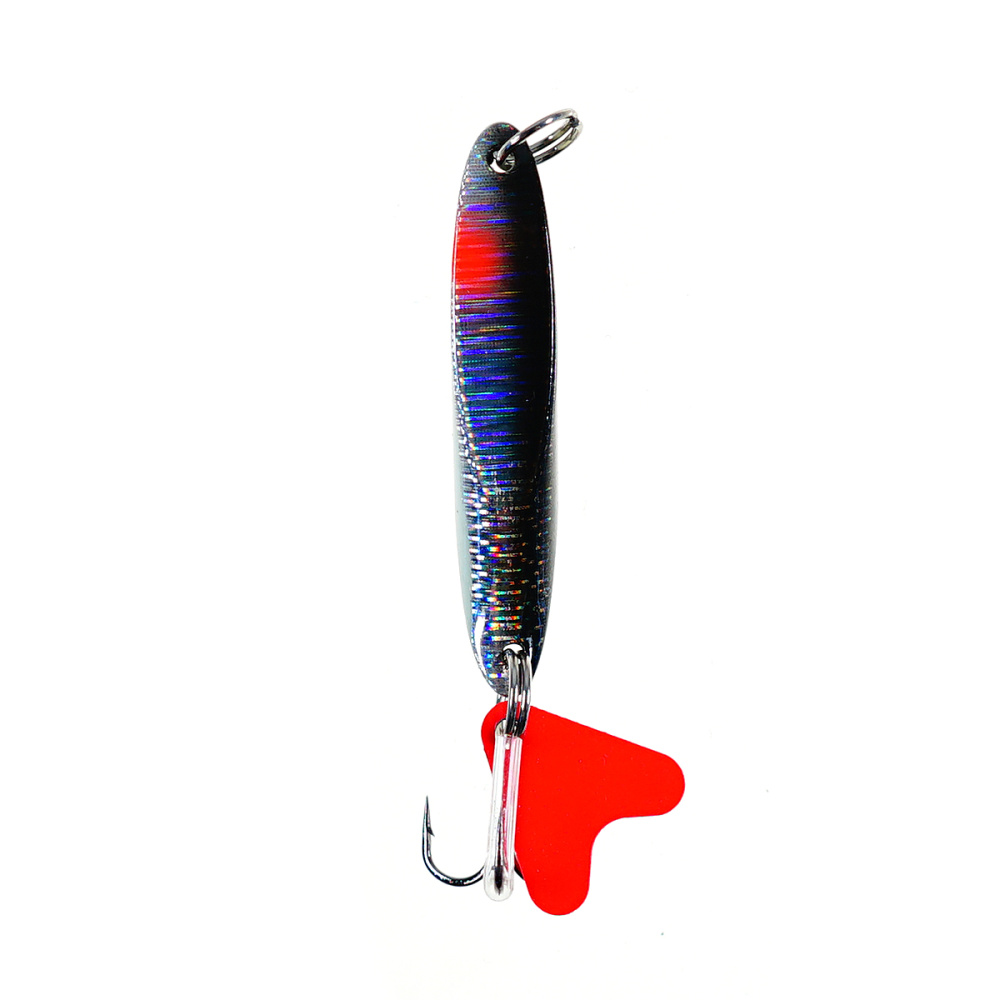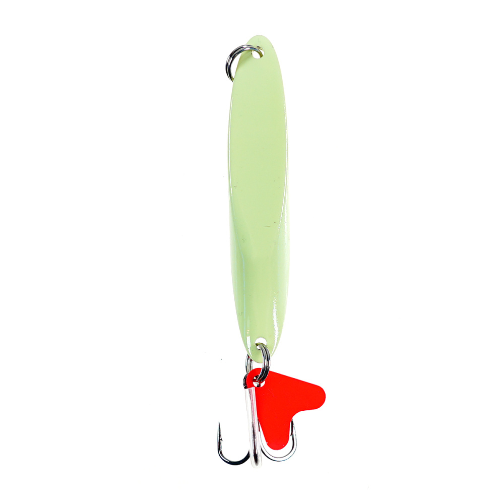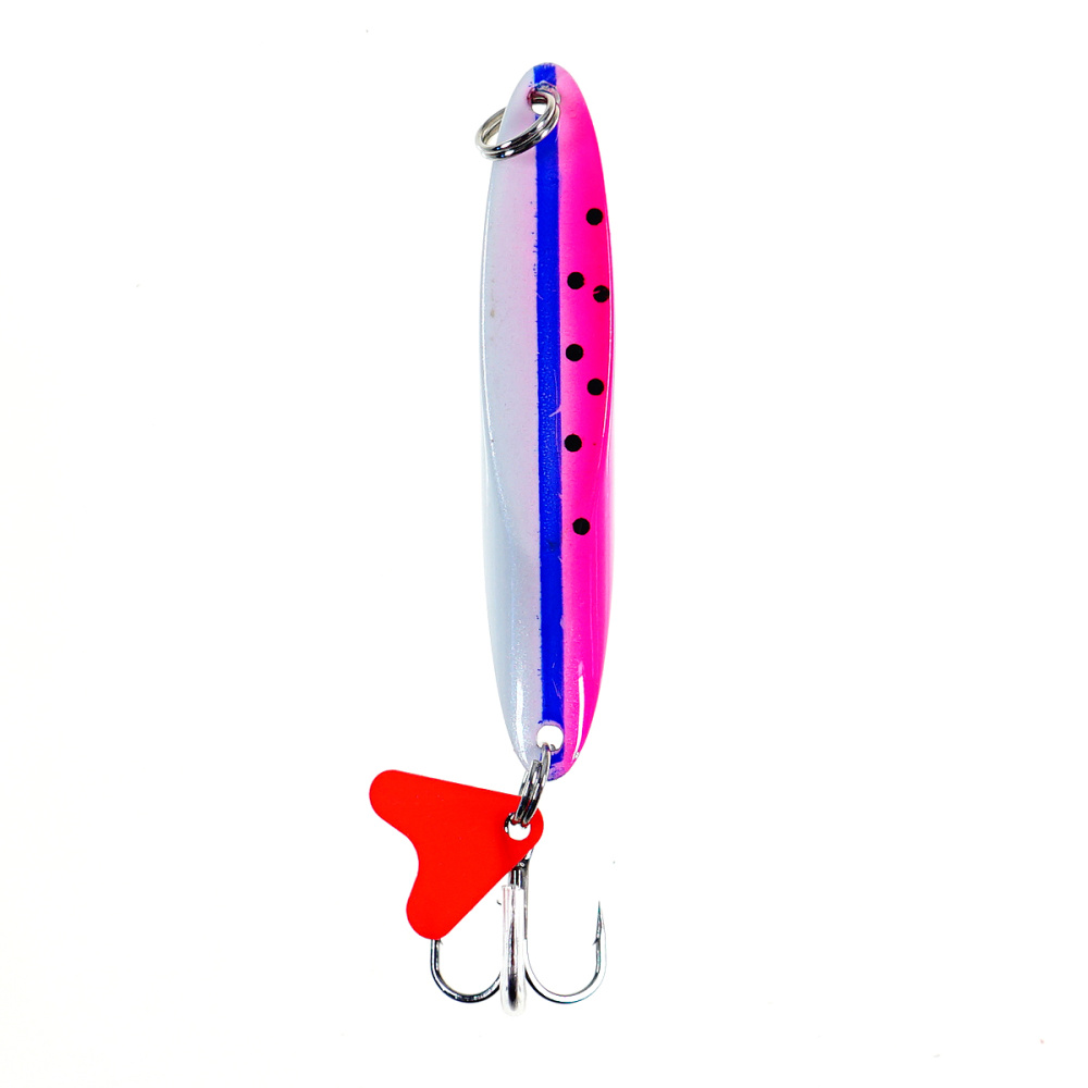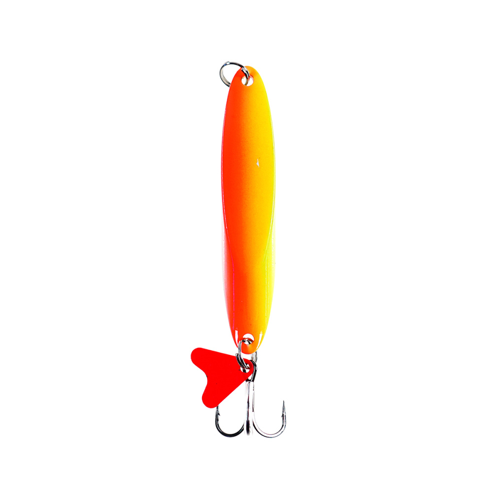 В сравнении с классическими «кастмастер»-формами, радиусные кромки создают более выраженную работу на сносе и в свободном падении — приманка дольше «живёт» в зоне атаки и провоцирует поклёвки пассивного хищника. Тройник оснащён красным пластиковым плавничком, формирующим точку прицеливания и повышающим реализацию поклёвок.
