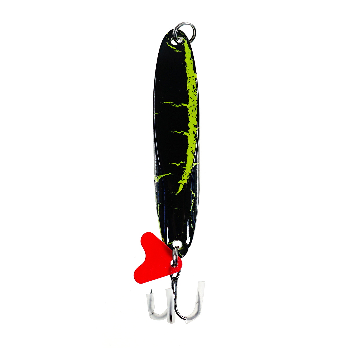 Двухсторонняя окраска с посеребрённой обратной стороной усиливает блеск и заметность в воде, а красный пластиковый плавничок на тройнике выступает точкой атаки — полезно при осторожном клеве. Оснащение выполнено тройником высокого класса, что снижает сходы при вываживании.