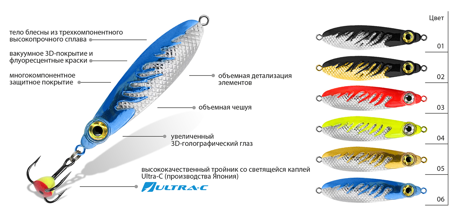 Продуманная конструкция приманки позволяет великолепно работать как в вертикальной, так и в горизонтальной плоскости, что является основным критерием уловистой блесны.