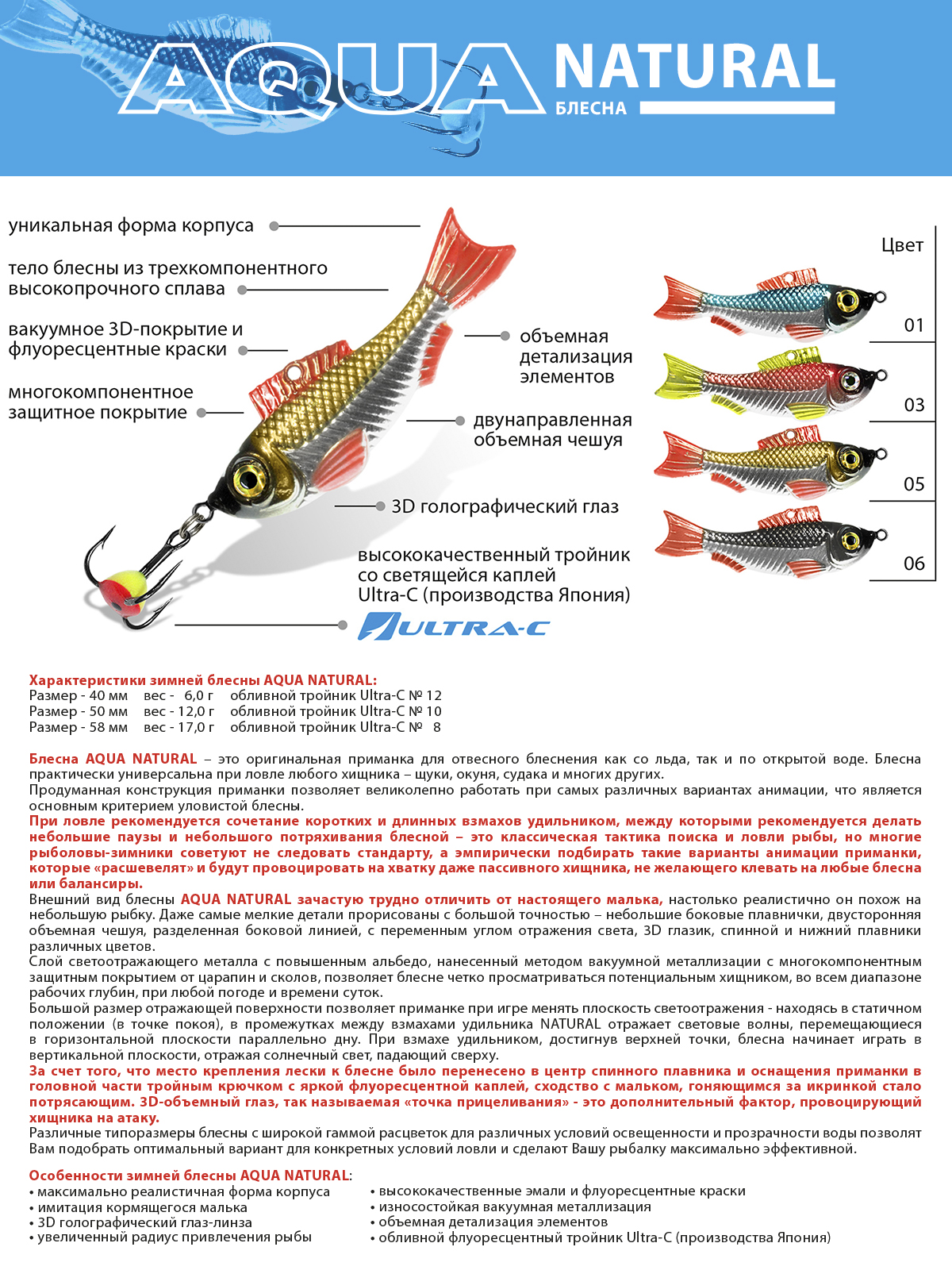 Блесна Натурал оснащена тройным крючком с фосфорной светящейся каплей, расположенной в головной части приманки.