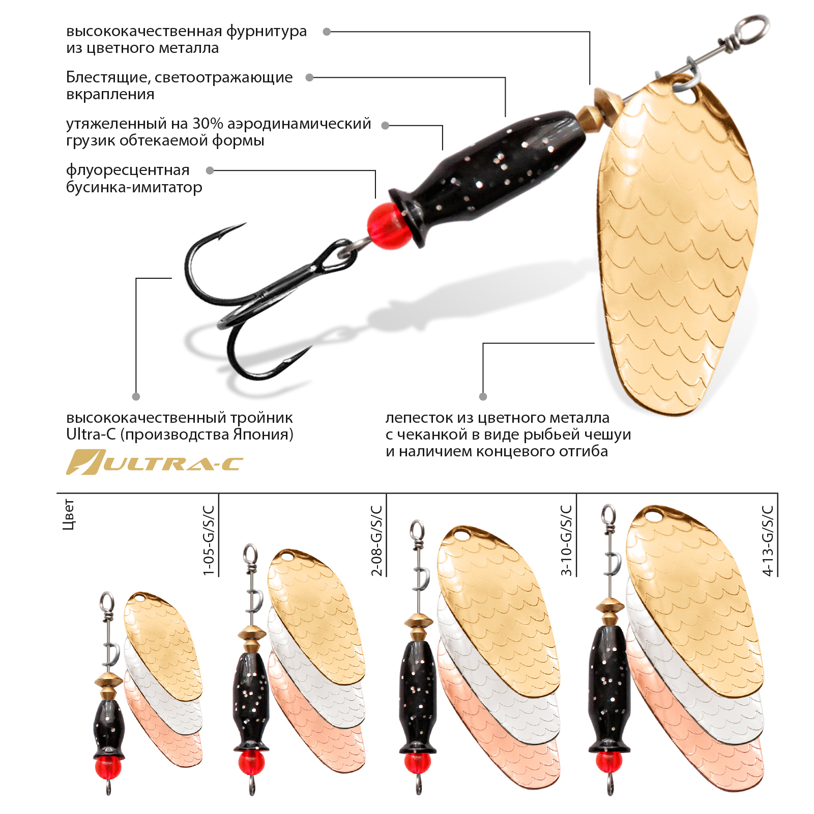 Главное отличие блесен серии AQUA ESTI BULLET это тщательно просчитанная комбинация из трех основных компонентов приманки: