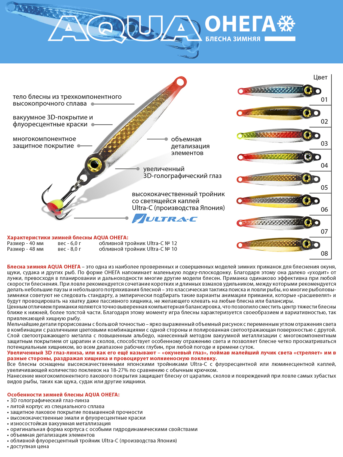 По форме ОНЕГА напоминает маленькую лодку-плоскодонку. Благодаря этому она далеко "уходит" от лунки, превосходя в дальноходности другие модели блесен.