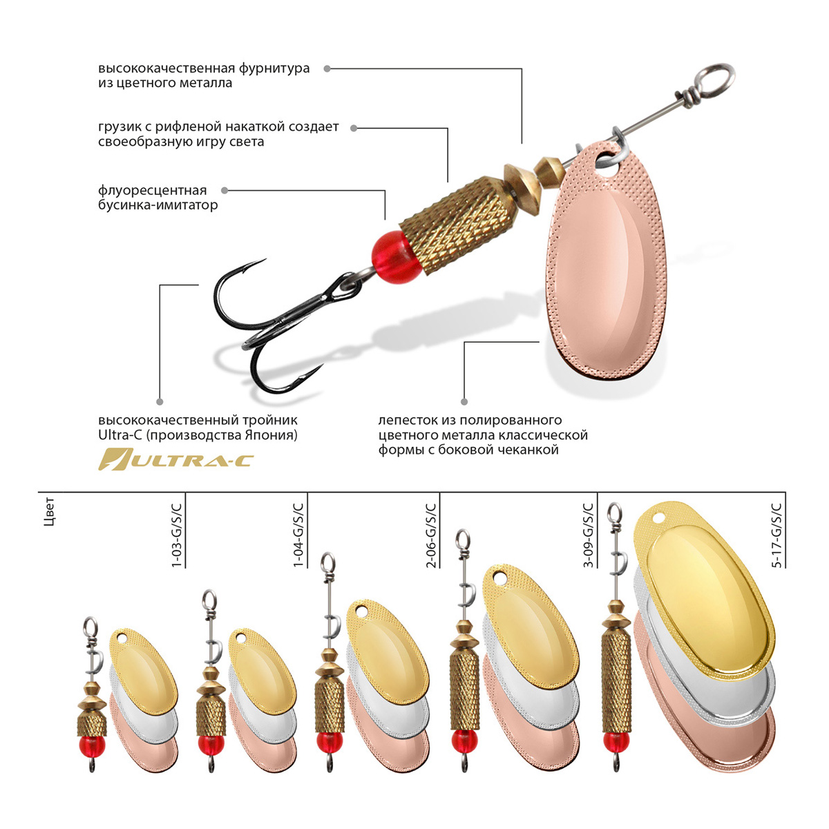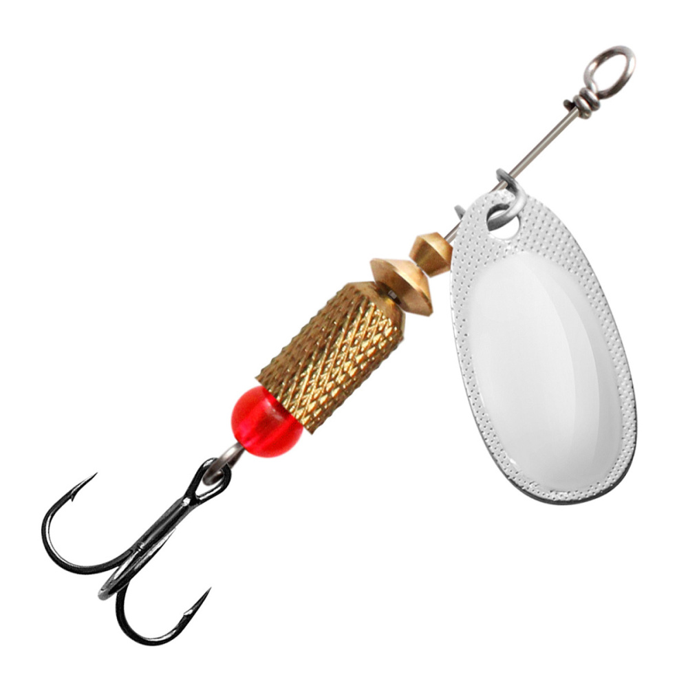 - полированного лепестка из цветного металла классической формы с боковой чеканкой, который делает игру приманки максимально стабильной – без «залипаний» в момент проводки. Выпуклая форма лепестка работает как сферическое зеркало, позволяя отражать любой лучик света, с какой бы стороны он не упал на блесну, что особенно полезно при ловле на глубине или в мутной, плохо освещенной воде.