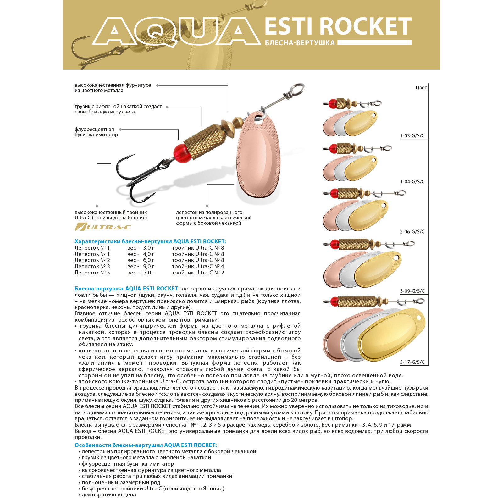 Главное отличие блесен серии AQUA ESTI ROCKETэто тщательно просчитанная комбинация из трех основных компонентов приманки: