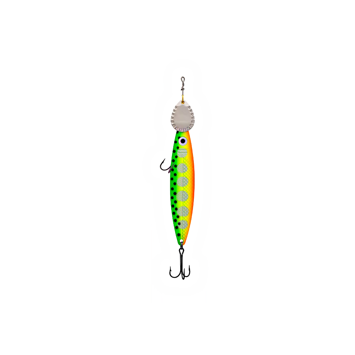 Конструкция блесны дополнена вращающимся лепестком, который обеспечивает частые вибрации для большего привлечения хищника.