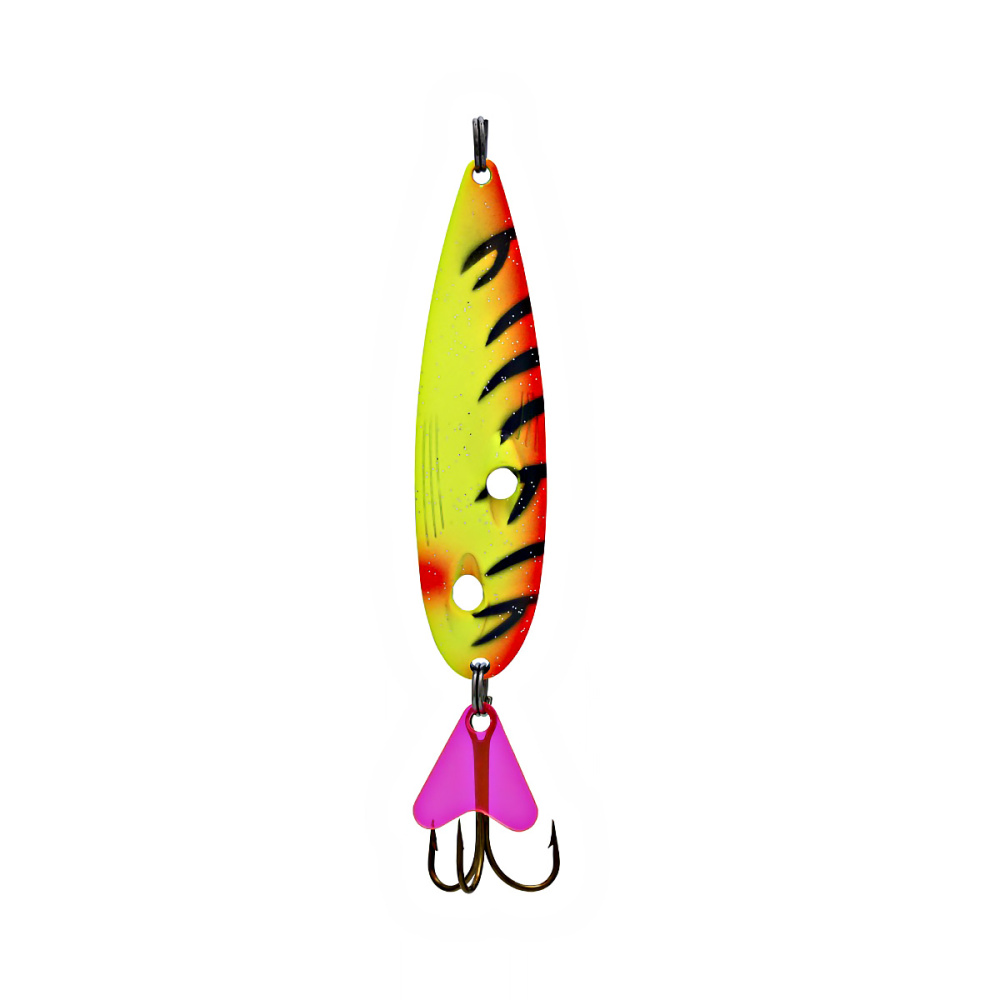 Уникальность игры блесны в двух сквозных отверстиях, расположенных под углом вдоль выпулкости. За счёт этих отверстий создаются кавитационные шумы, которые также раздражают хищника на атаку блесны.