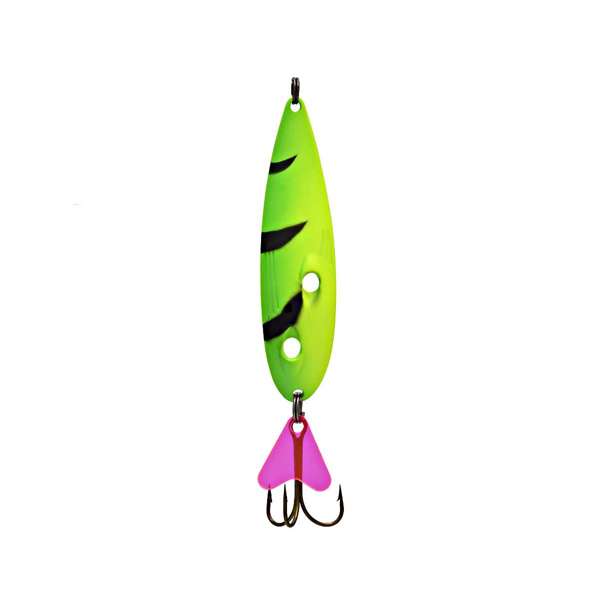 Уникальность игры блесны в двух сквозных отверстиях, расположенных под углом вдоль выпулкости. За счёт этих отверстий создаются кавитационные шумы, которые также раздражают хищника на атаку блесны.
