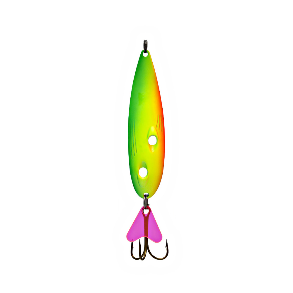 Уникальность игры блесны в двух сквозных отверстиях, расположенных под углом вдоль выпулкости. За счёт этих отверстий создаются кавитационные шумы, которые также раздражают хищника на атаку блесны.