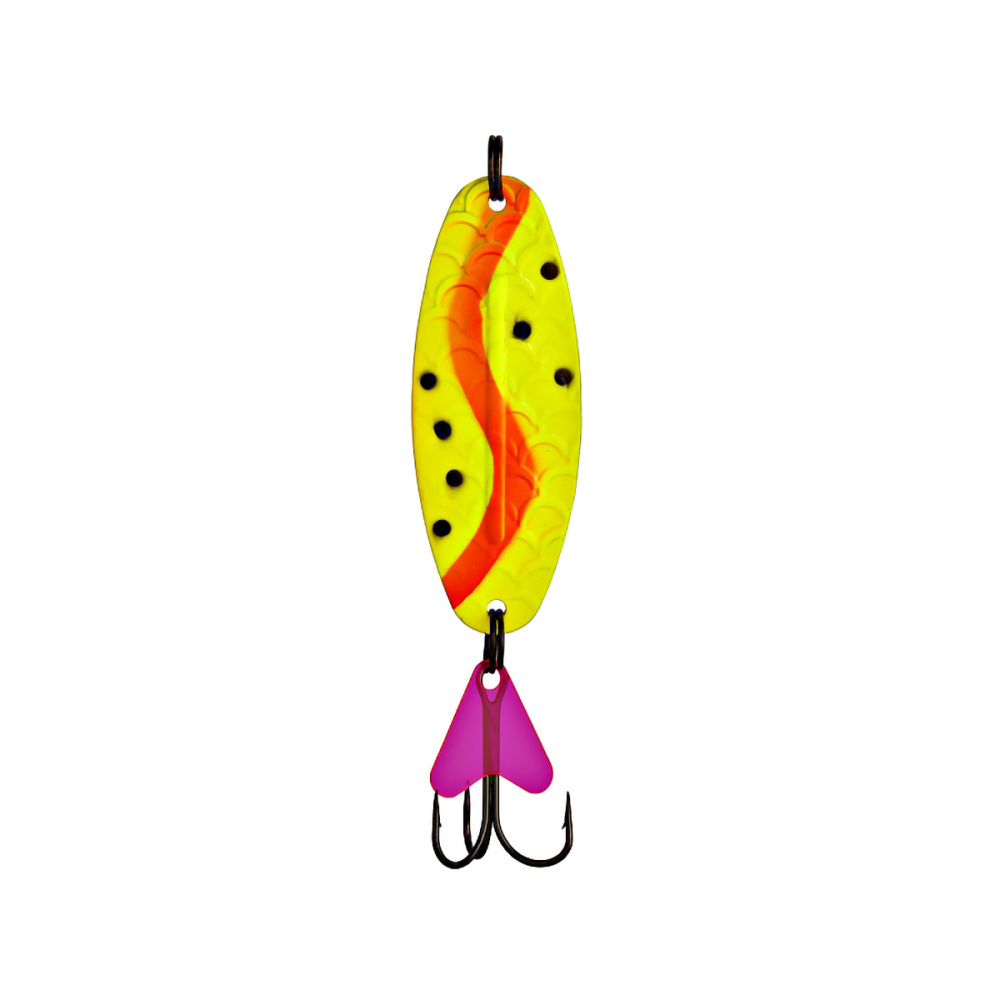 Игра блесны скоростная, колебания длинные, не частые. Всё это полностью имитирует плывущую рыбку, которую хищник не оставит без внимания.