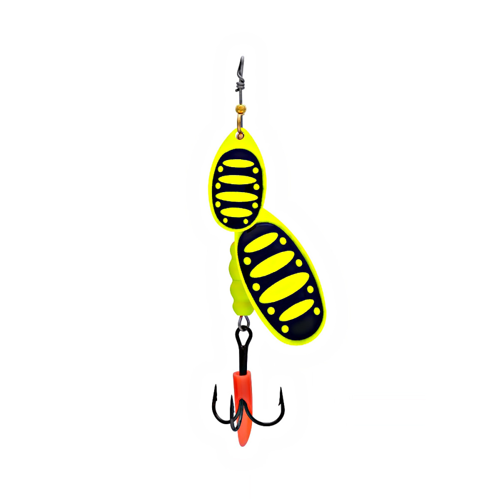 А сердечник, похожий на маленькую гусеницу, делает блесну более привлекательной для хищника. Всю игру блесны можно изменять скоростью проводки - чем выше скорость проводки, тем выше скорость вращения лепестков, и наоборот. Блесна оснащена надёжным тройником Mustad.