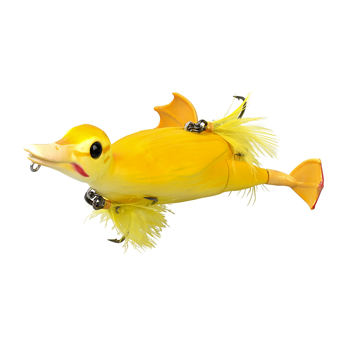 Вращающиеся лапы придают жизнь приманке, создавая брызги, пузыри и волновой след, которые приманивают хищников с дальнего расстояния. В открытой воде используются два тройника с перьями - один на животе, другой на спине.
