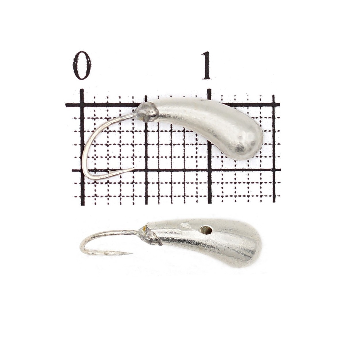 Отличие от других «уралок»: сквозное отверстие в теле вместо ушка — леска проходит по оси мормышки, что улучшает баланс и снижает парусность; крючок №14 под тонкую насадку (мотыль) повышает реализацию осторожных поклевок. Серебристый (никель) вариант универсален по прозрачной воде и в ясную погоду.