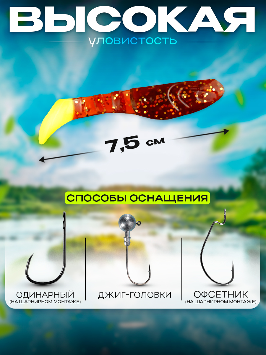 Виброхвосты Relax Kopyto BLS 3" 7,5см цвет T097 (моторное масло, желтый, с блесткам) (10шт) (BLS3)