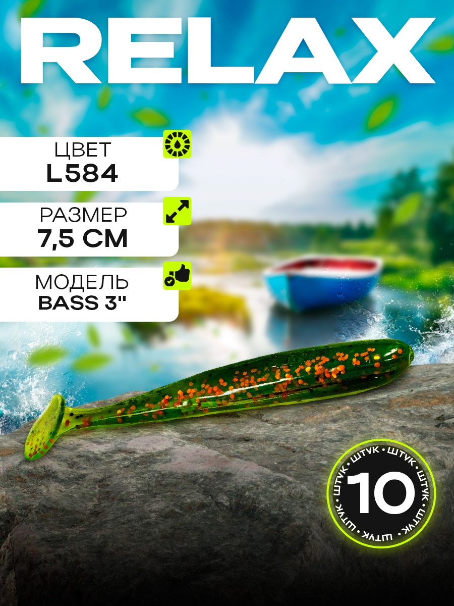 Виброхвосты Relax Bass 3" 7,5см цвет L584 (зеленый, прозрачный, с блестками) (10шт) (BAS3)