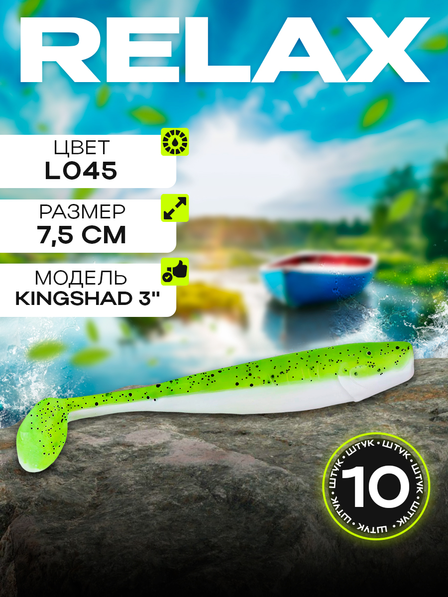 Виброхвосты Relax Kingshad 3" 7,5см цвет L045 (белый, зеленый, с блестками) (10шт) (KS3)