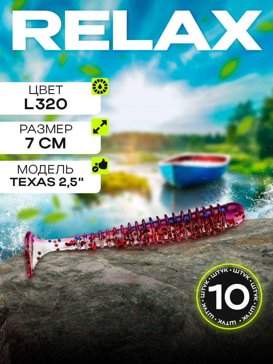 Виброхвосты Relax Texas 2.5" 7см цвет L320 (прозрачный, лиловый, синие и красные блестки) (10шт) (TX