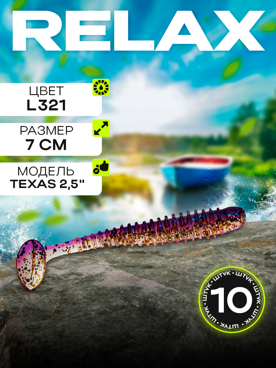 Виброхвосты Relax Texas 2.5" 7см цвет L321 (прозрачный, лиловый, синие и желтые блестки) (10шт) (TX2