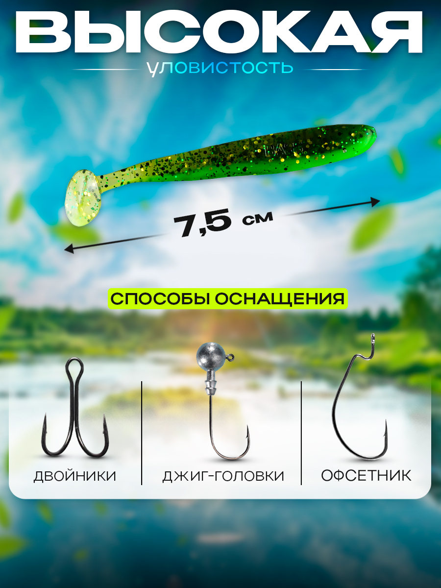 Виброхвосты Relax Bass 3" 7,5см цвет L140 (зеленый, с блестками) (10шт) (BAS3)