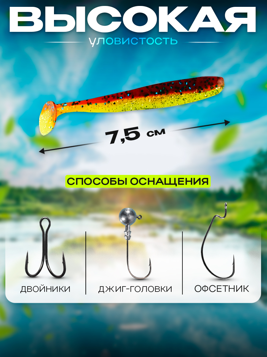 Виброхвосты Relax Bass 3" 7,5см цвет L054 (желтый, коричневый, зеленые блестки) (10шт) (BAS3)