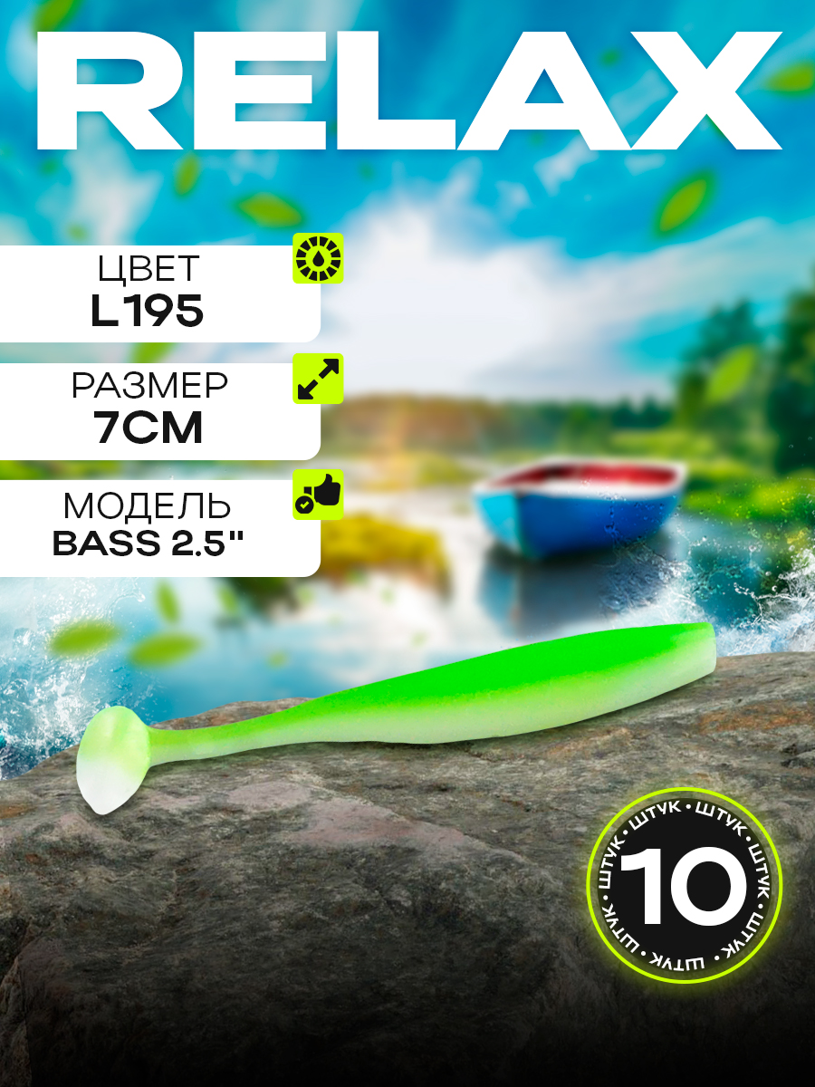 Виброхвосты Relax Bass 2.5" 7см цвет L195 (белый, зеленый) (10шт) (BAS25)