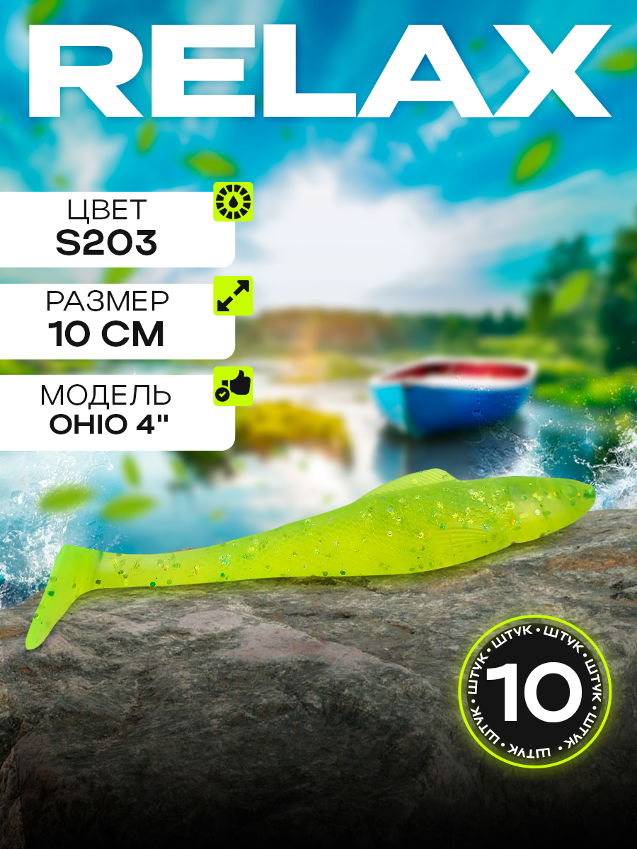 Виброхвосты Relax Ohio 4" 10см цвет S203 (желтый, прозрачный, с блестками) (10шт) (OH4)