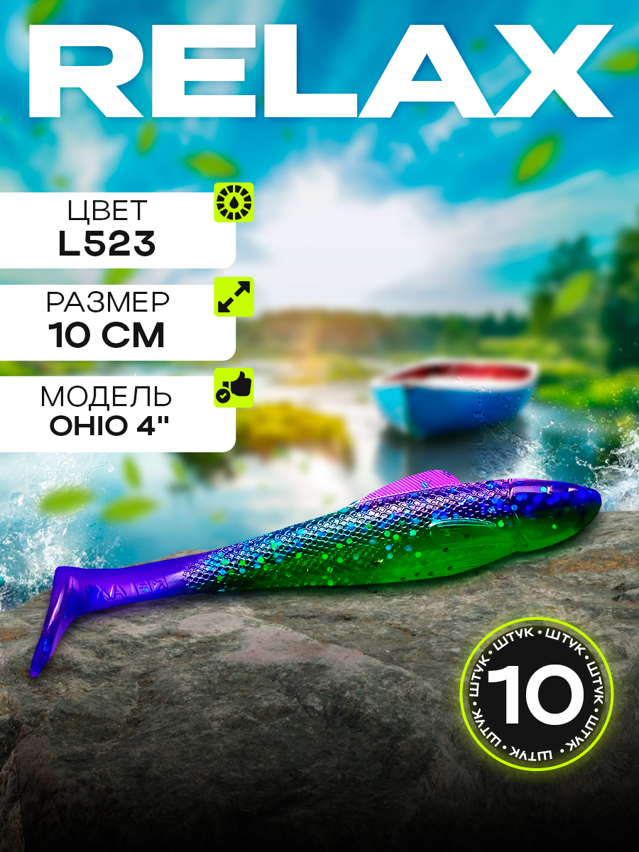 Виброхвосты Relax Ohio 4" 10см цвет L523 (зеленый, синий, зеленые и синие блестки) (10шт) (OH4)