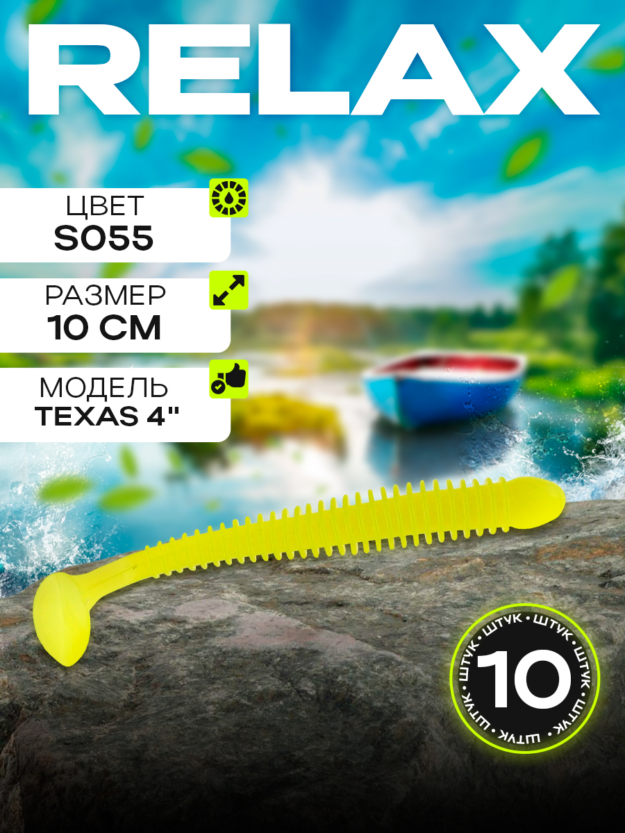 Виброхвосты Relax Texas 4" 10см цвет S055 (желтый) (10шт) (TX4)