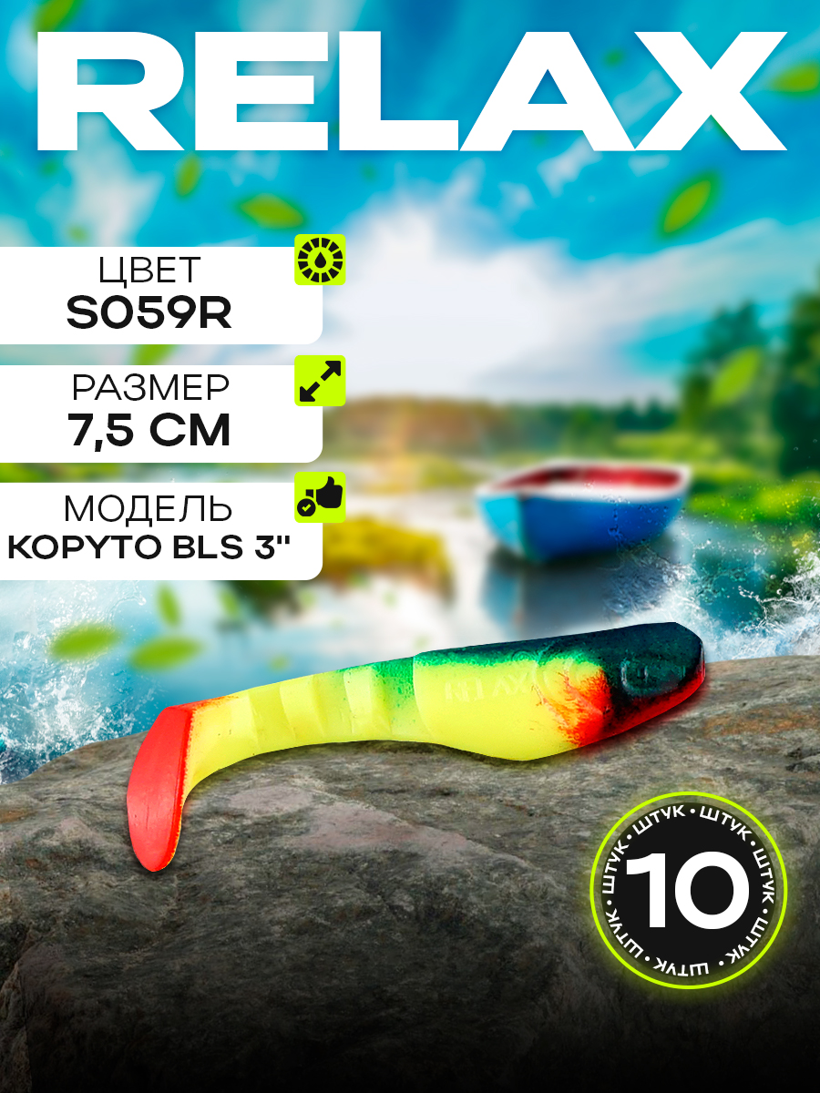 Виброхвосты Relax Kopyto BLS 3" 7,5см цвет S059R (желтый, зеленый, черный, красный) (10шт) (BLS3)
