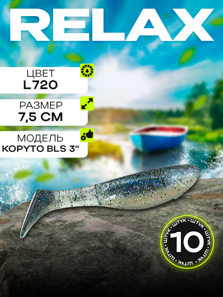 Виброхвосты Relax Kopyto BLS 3" 7,5см цвет L720 (прозрачный, синие блестки) (10шт) (BLS3)