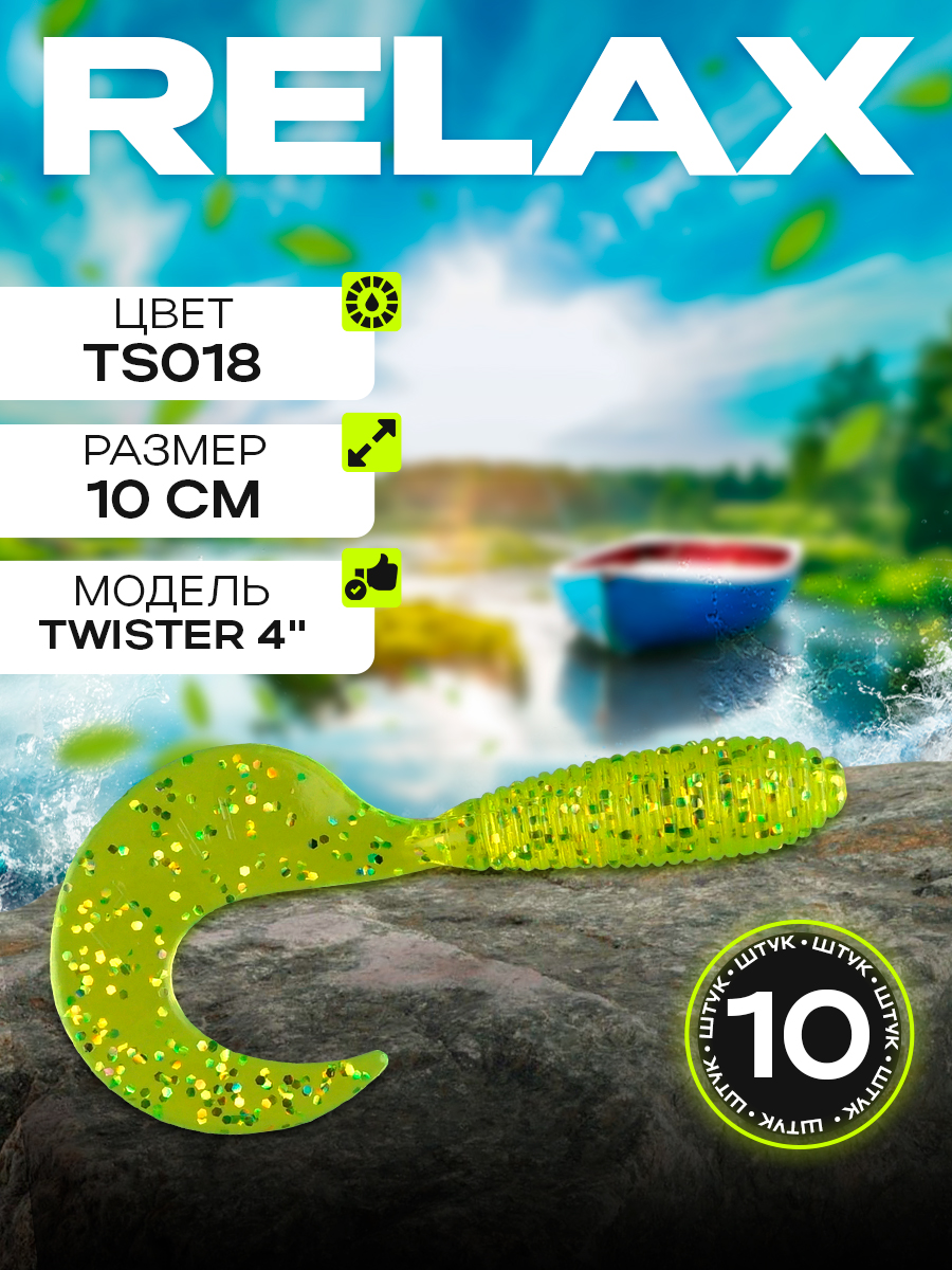 Твистеры Relax 4" 10см цвет TS018 (салатовый, с блестками) (10шт) (VR4)