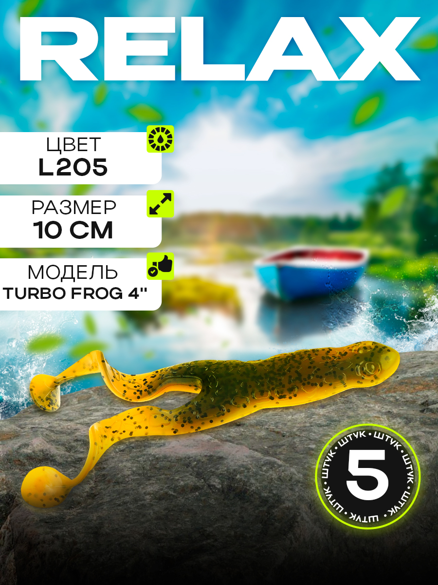 Приманки Relax Turbo Frog (лягушка) 4" 10см цвет L205 (желтый, болотный, с блестками) (5шт) (TF4)