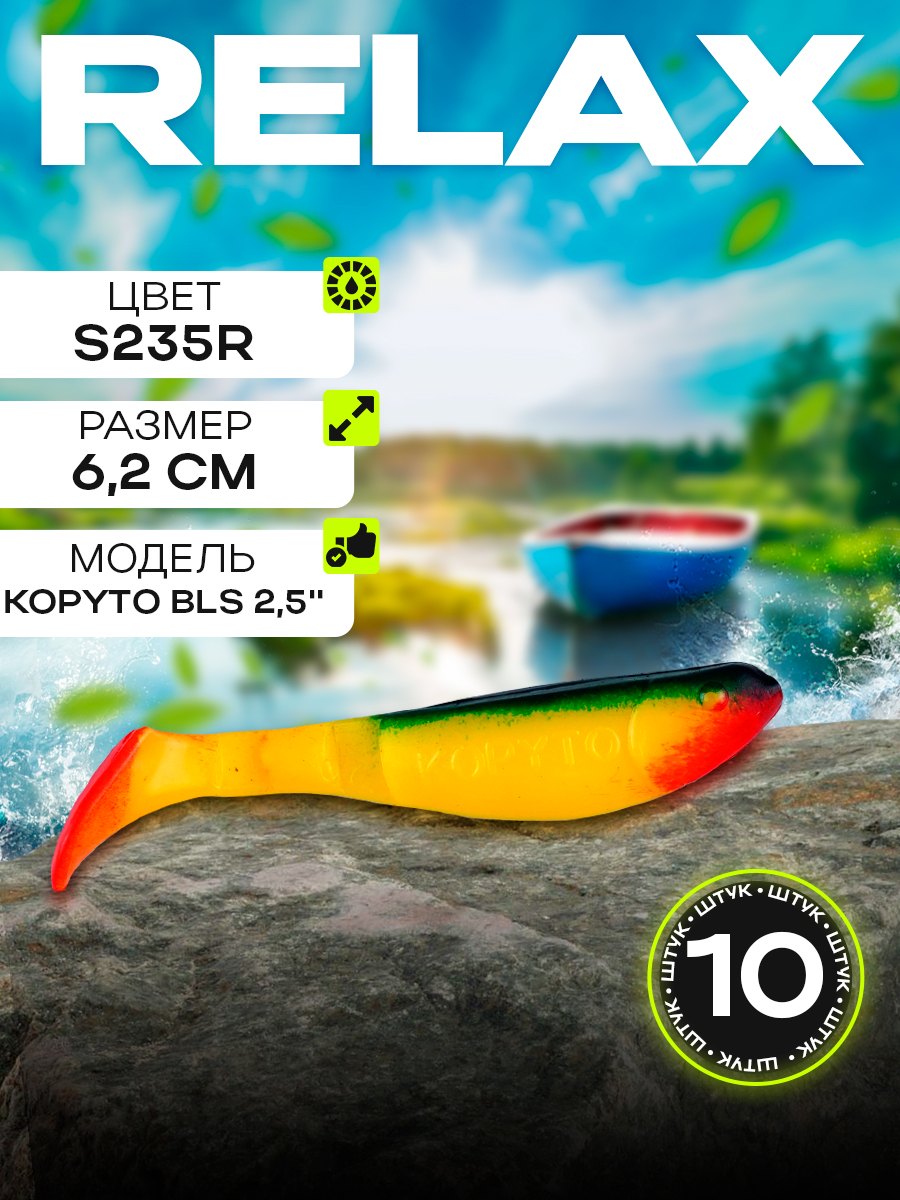 Виброхвосты Relax Kopyto BLS 2.5" 6,2см цвет S235R (желтый, зеленый, красный, черый) (10шт) (BLS25)