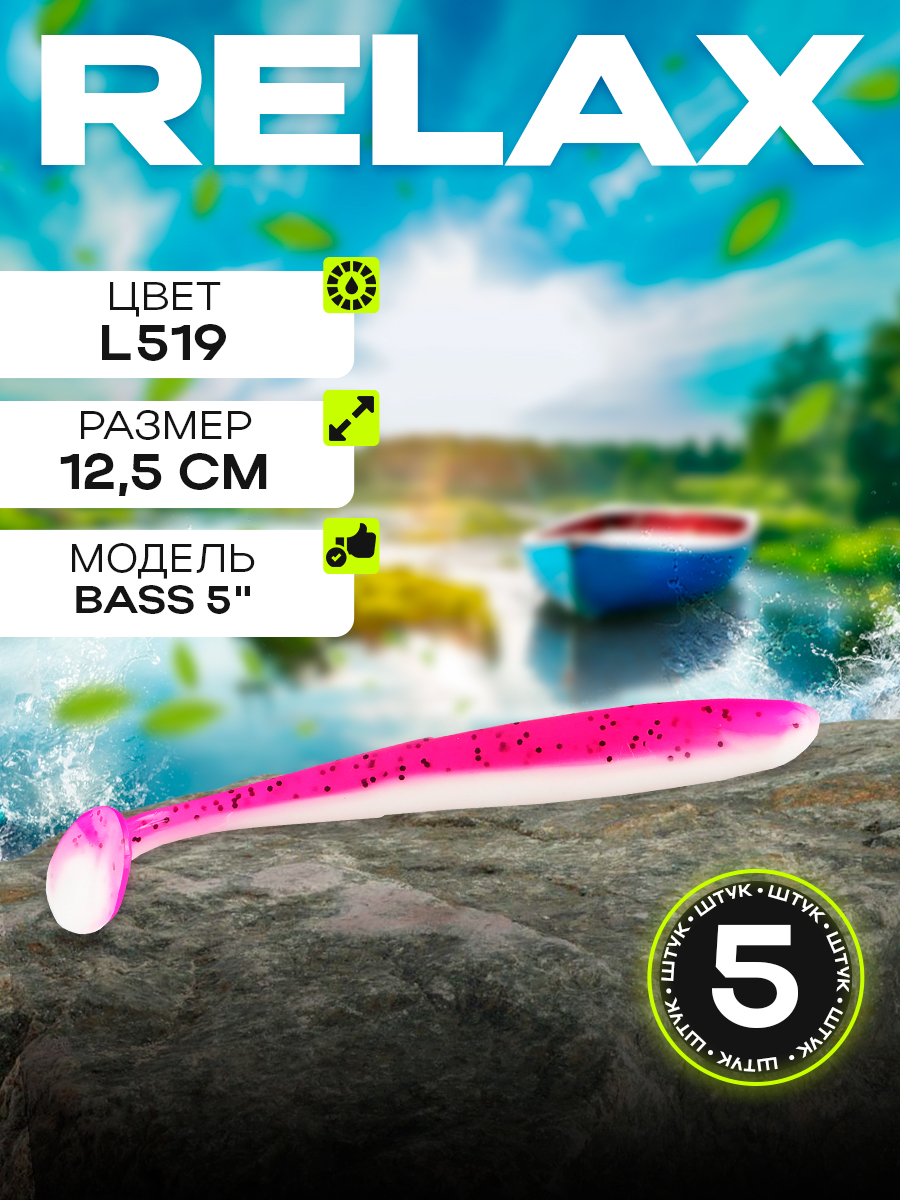 Виброхвосты Relax Bass 5" 12,5см цвет L519 (белый, розовый, с блестками) (5шт) (BAS5)