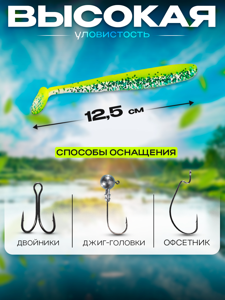 Виброхвосты Relax Bass 5" 12,5см цвет L249 (прозрачный, желтый, синие блестки) (5шт) (BAS5)