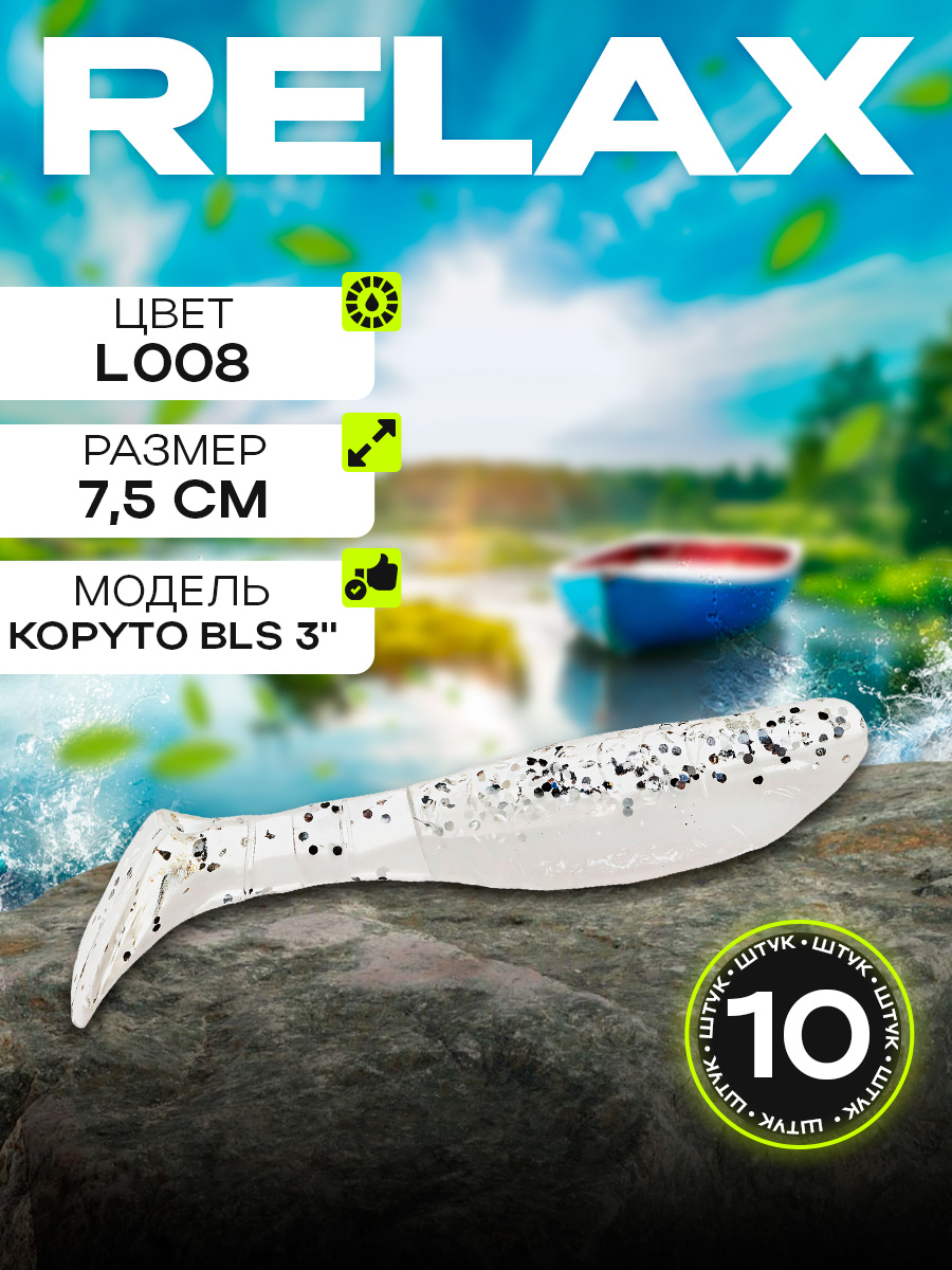 Виброхвосты Relax Kopyto BLS 3" 7,5см цвет L008 (белый, с блестками) (10шт) (BLS3)