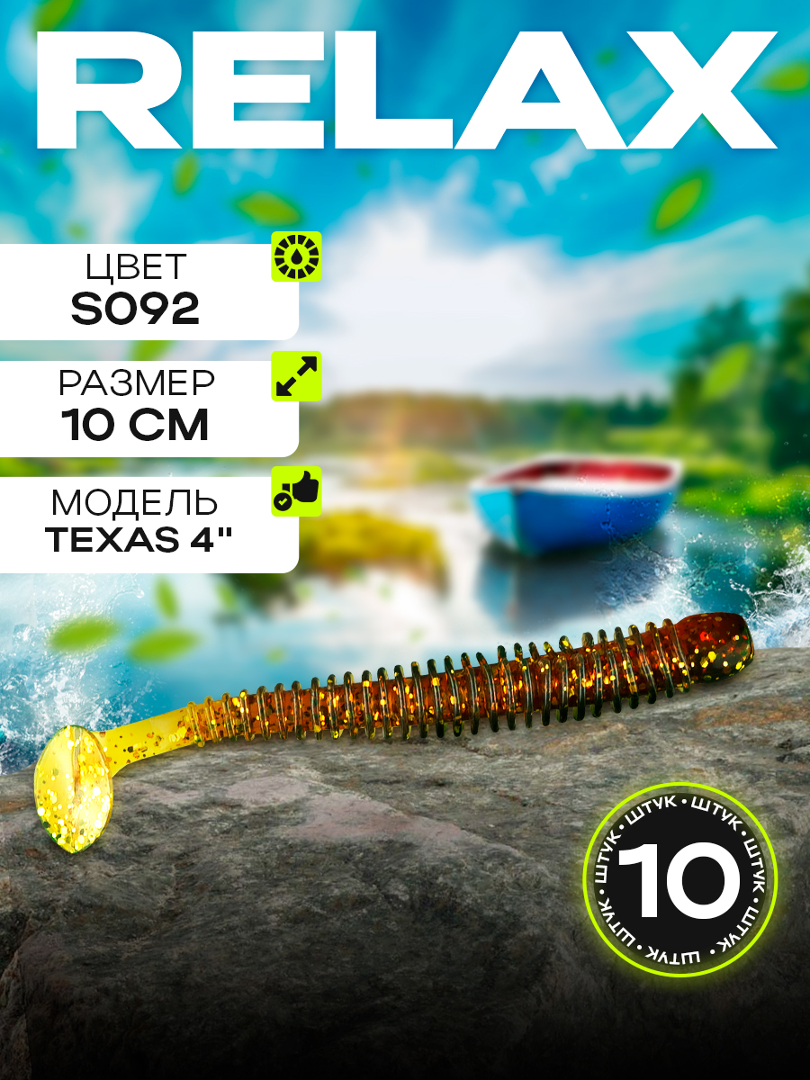 Виброхвосты Relax Texas 4" 10см цвет S092 (машинное масло, прозрачный, с блестками) (10шт) (TX4)